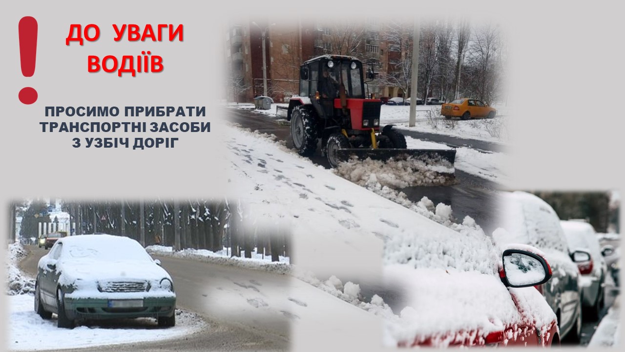 🚗❗ Для оперативного та якісного прибирання снігу з доріг просимо терміново прибрати транспортні засоби та утриматися від паркування автомобілів на узбіччях доріг і проїжджій частині.