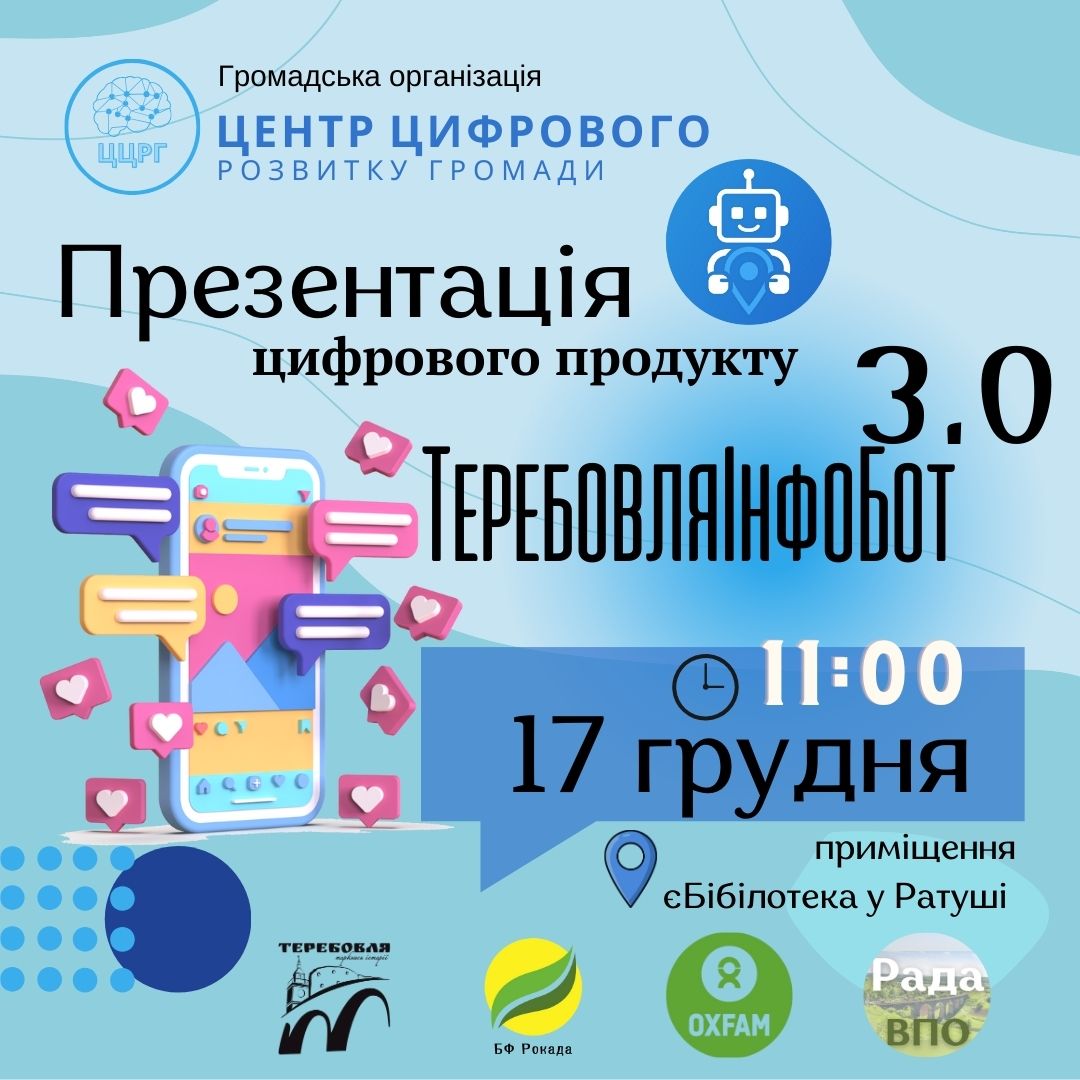 Запорошуємо Вас на презентацію цифрового продукту ТеребовляІнфоБот – цифрової системи у вигляді сайту-каталогу та чат-боту, де зібрана інформація про локації та послуги громади.