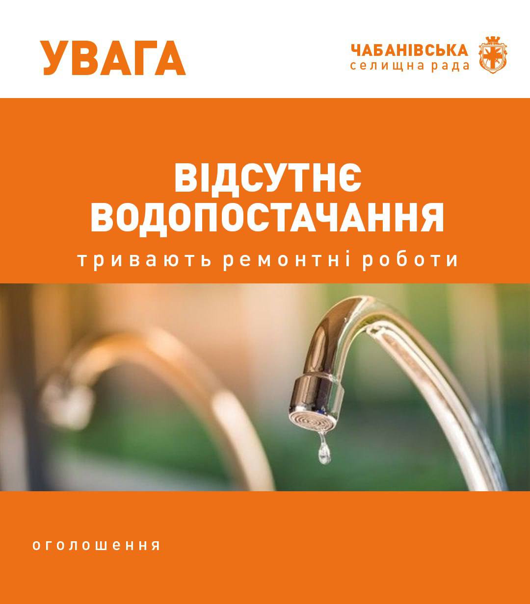 🛠 У зв’язку з аварійною ситуацією на водогоні тимчасово відсутнє водопостачання в селищі Чабани.