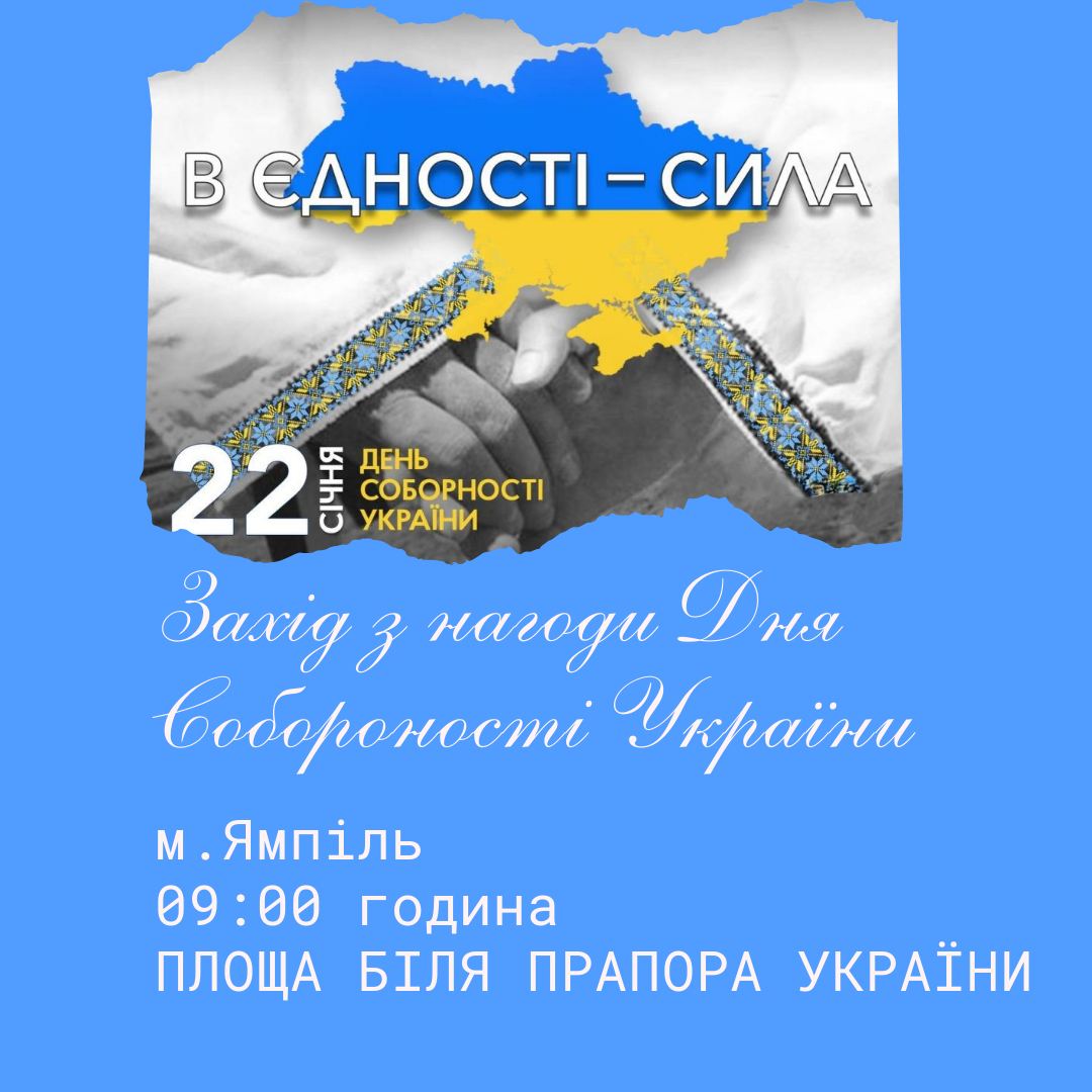У центрі громади – місті Ямпіль о 9:00 годині на площі біля Прапора України відбудеться захід приурочений цій важливій даті – Дню Соборності України.
