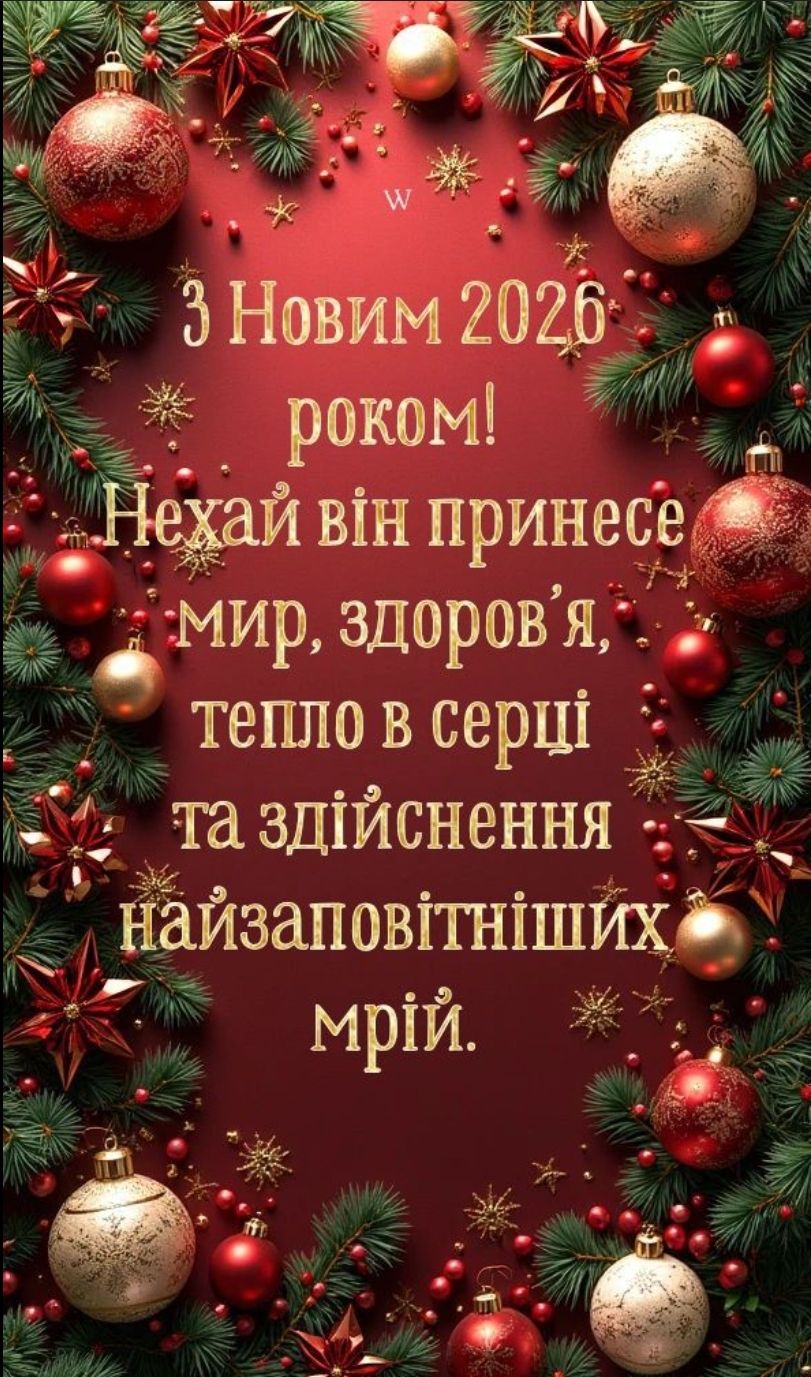 З Новим роком 2026! Нехай він буде спокійним, передбачуваним і добрим до всіх ваших починань. Бажаю, щоб труднощі обходили стороною, а хороші новини знаходили вас самі. Нехай у серці буде місце для надії, а в житті – для подій, які роблять дні кращими. Миру, тепла, здоров’я і благополуччя!