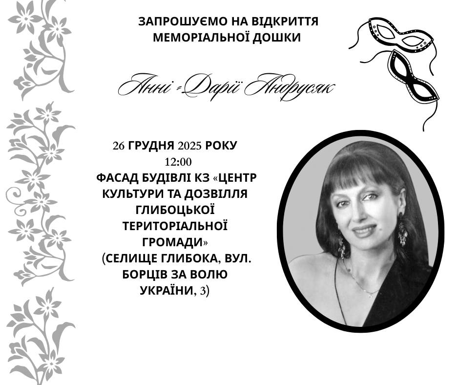 Глибоцька селищна рада запрошує вас долучитися до важливого пам`ятного заходу – відкриття та освячення меморіальної дошки заслуженій артистці України Анні-Дарії Андрусяк, який відбудеться: