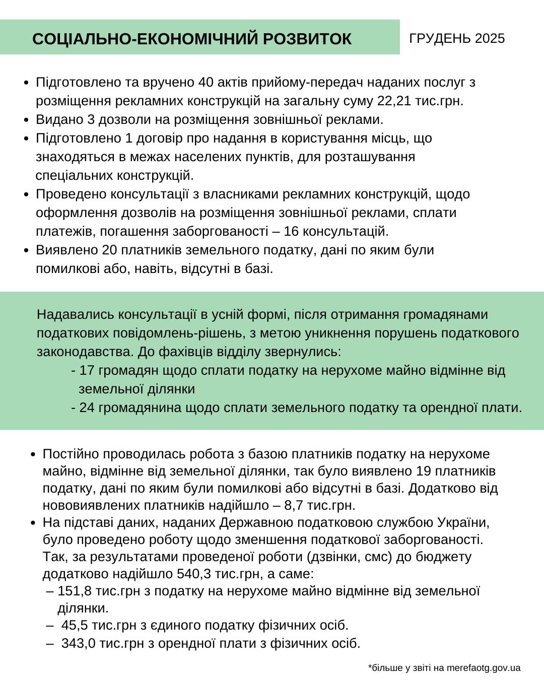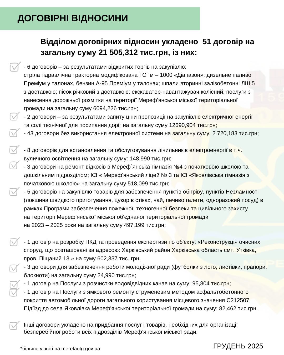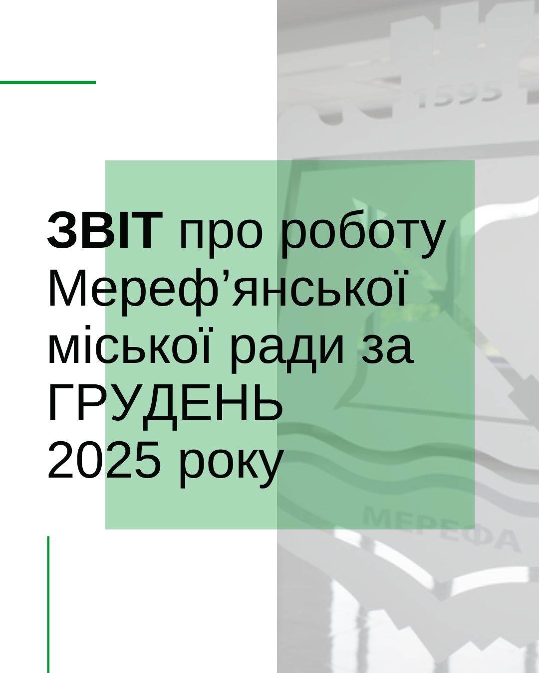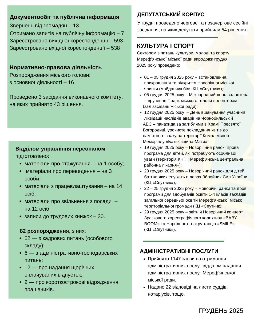 Шановні мереф’яни! З метою ширшого висвітлення діяльності відділів, що входять до структури Мереф’янської міської ради, пропонуємо вашій увазі звіт щодо проведеної роботи за ГРУДЕНЬ 2025 року.