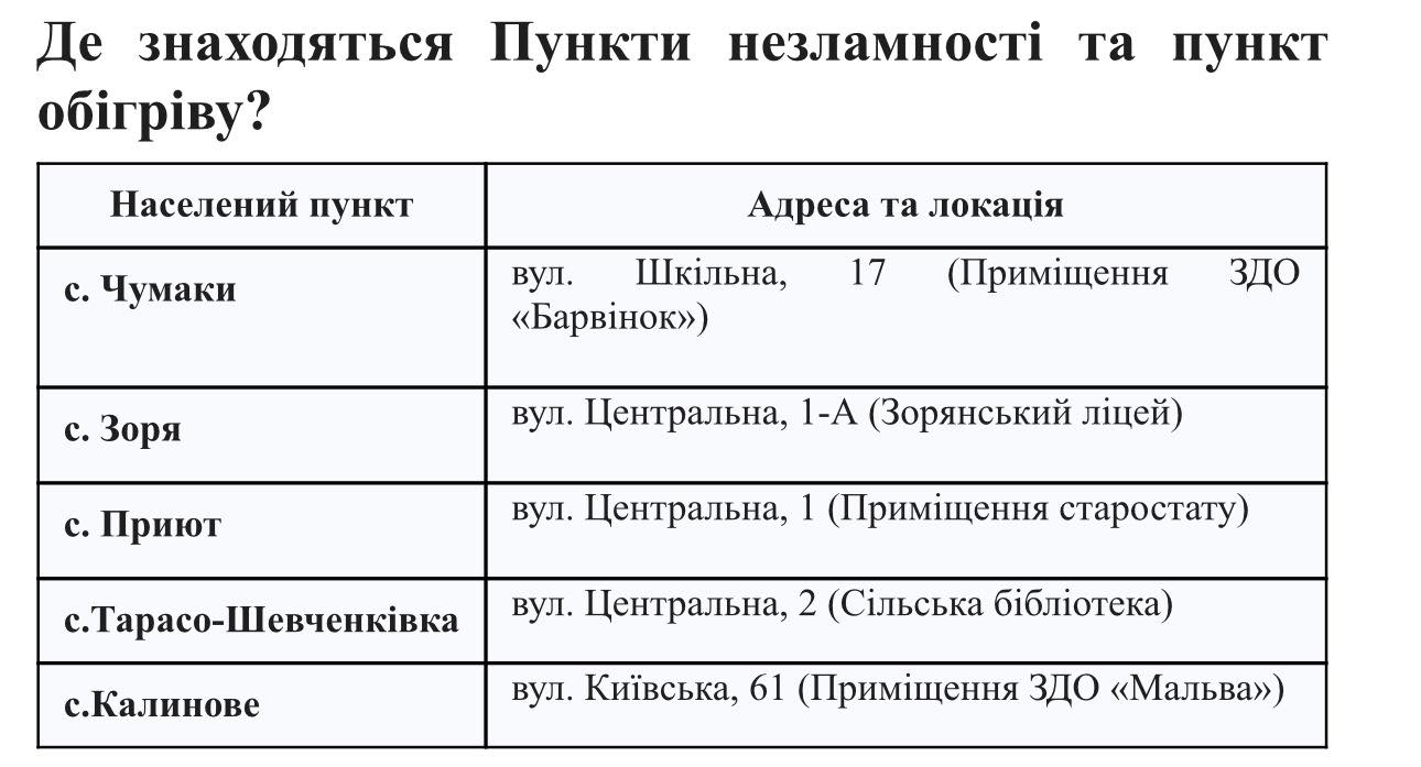 Нагадуємо, що на території нашої громади цілодобово функціонують Пункти незламності. Це місця, де ви можете отримати допомогу, зігрітися та залишатися на зв’язку навіть під час тривалих відключень електроенергії.