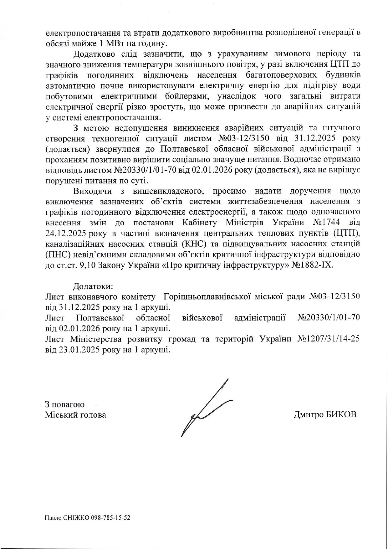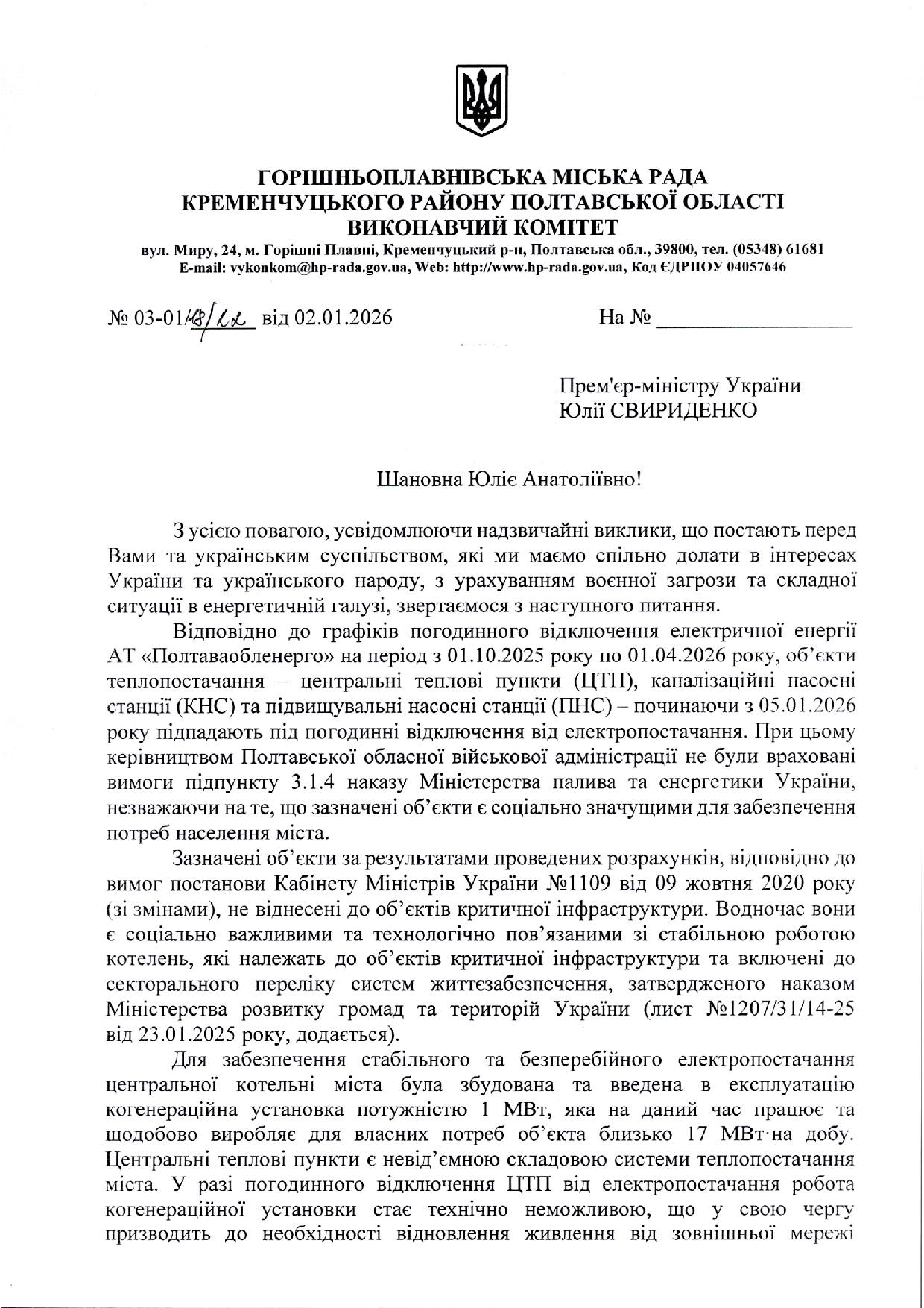 З метою недопущення виникнення аварій на мережах та загрози виникнення техногенної ситуації міська рада на чолі з міським головою звернулися до Полтавської обласної військової адміністрації та до Прем’єр-міністра України з проханням не застосовувати відключення соціально важливих об’єктів, що забезпечують теплом та водою мешканців міста.
