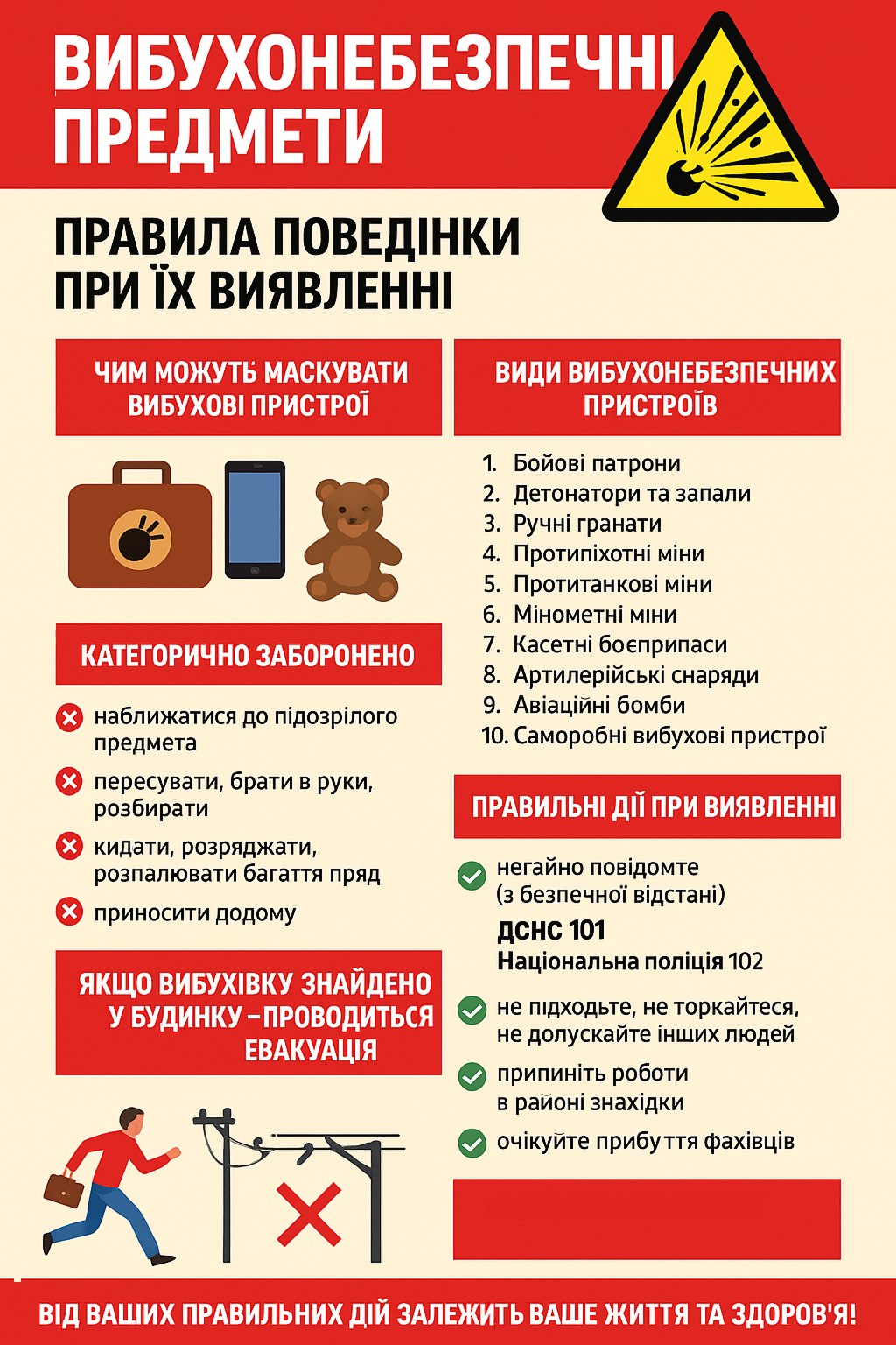 ☝️ Якщо ви знайшли вибухонебезпечний предмет (далі – ВНП), не чіпайте його. Позначте місце знахідки, відведіть інших людей на безпечну відстань (не менше 100 метрів) і негайно повідомте про це за номером 101 або 102. Не користуйтеся телефоном поблизу підозрілого предмета та не намагайтеся його знешкодити самостійно.