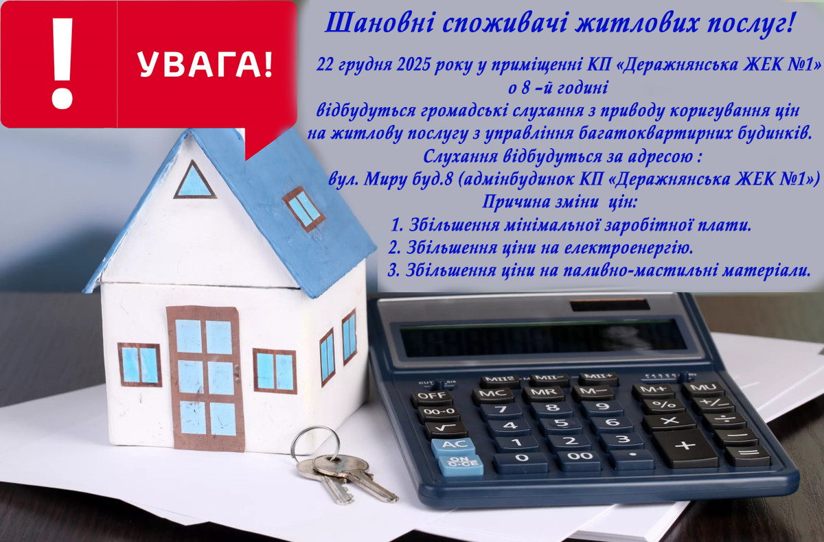 22 грудня 2025 року в приміщенні КП «Деражнянська ЖЕК №1» о 8 –й годині відбудуться громадські слухання з приводу коригування цін на житлові послуги з управління багатоквартирних будинків.