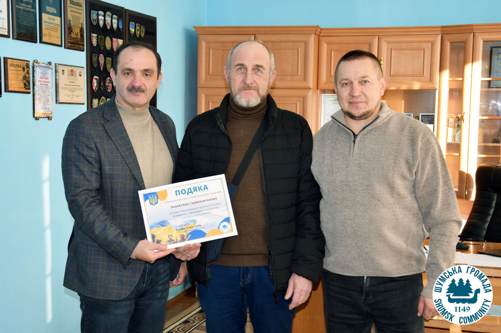 До міської ради завітав житель села Рохманів Валентин Скрипківський. У 2024 році він став до лав Збройних Сил України та відтоді проходить службу в прикордонних військах на Харківщині. Міський голова Вадим Боярський і староста Володимир Дзерук висловили щиру вдячність від імені всієї Шумської громади за патріотизм і мужність, які демонструє наш захисник.