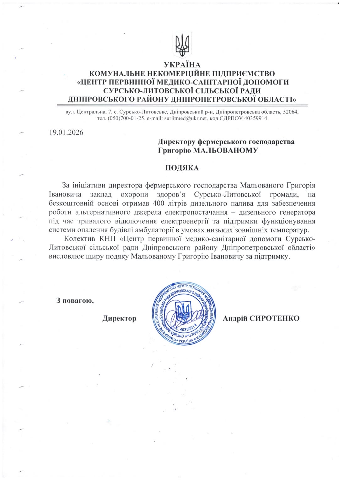 Висловлюємо глибоку вдячність Мальованому Григорію Івановичу за надану допомогу — передачу 400 літрів дизельного палива для роботи генератора Сурсько-Литовського ЦПМСД в зимовий період. Завдяки Вашій підтримці медичний заклад має можливість стабільно працювати навіть у складних умовах, забезпечуючи мешканців громади необхідною медичною допомогою та теплом.