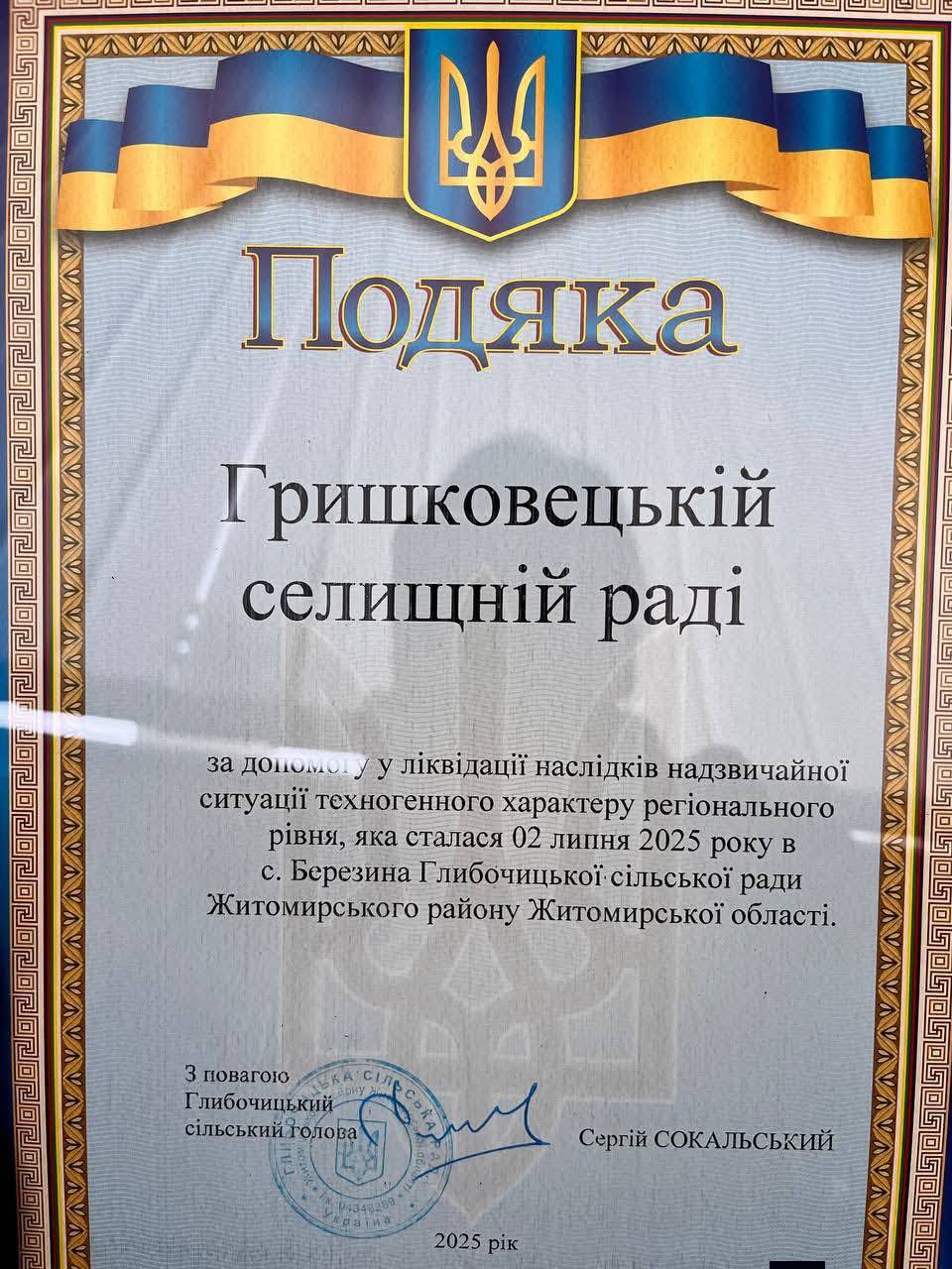 Щиро вдячні за подяку та за високу оцінку роботи Гришковецької територіальної громади, висловлену головою Глибочицької громади Сергієм Вікторовичем Сокальським🤝