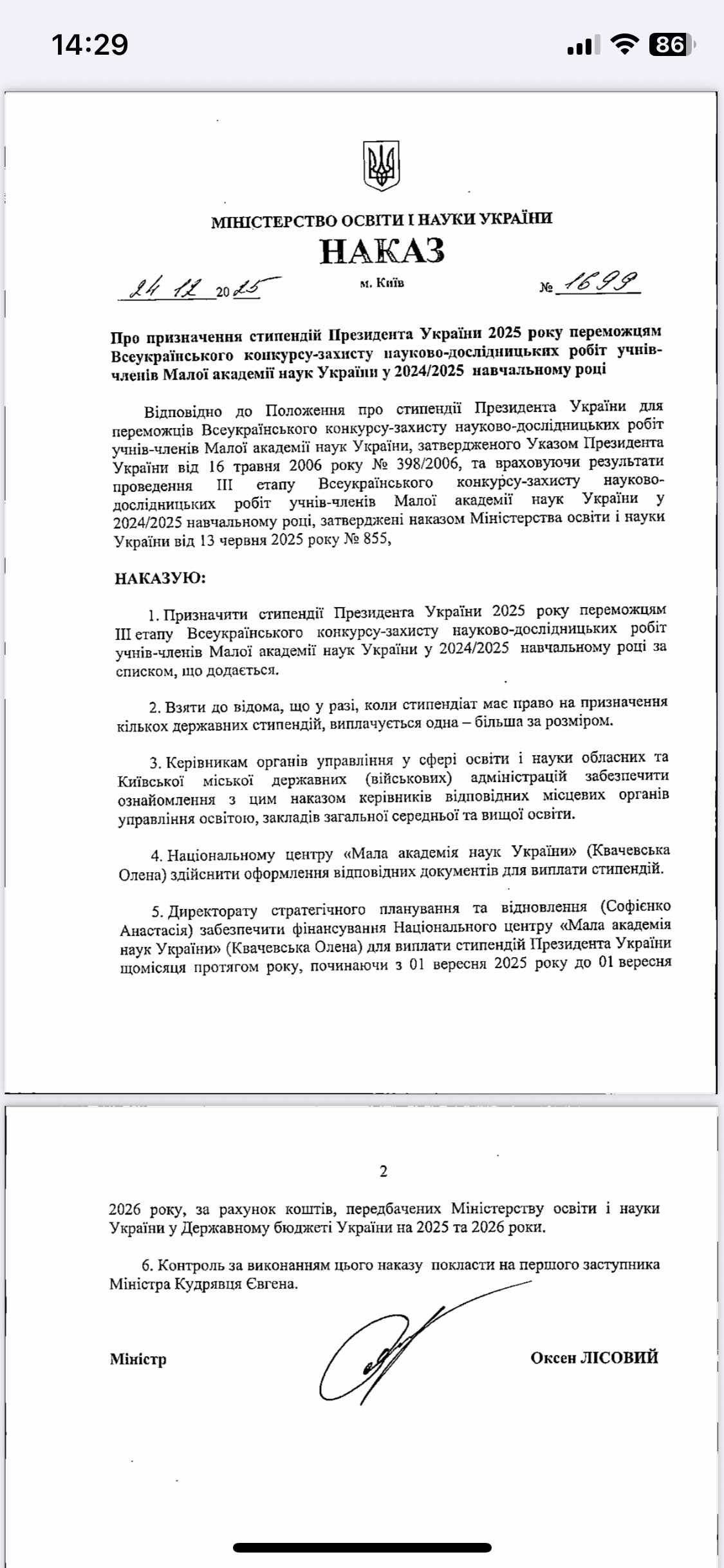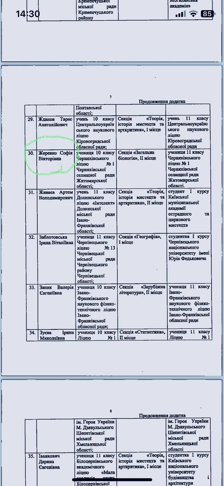 Відділ освіти, молоді та спорту Черняхівської селищної ради щиро вітає ученицю 11 класу Черняхівського ліцею номер один – Софію Жеревко з призначенням стипендії Президента України 2025 року🇺🇦 переможцям Всеукраїнсько конкурсу-захисту науково-дослідницьких робіт членів Малої академії наук України.