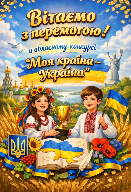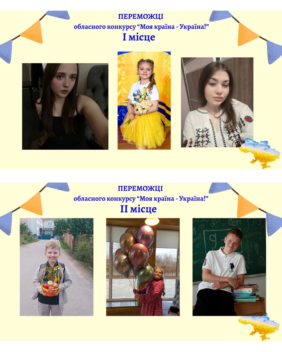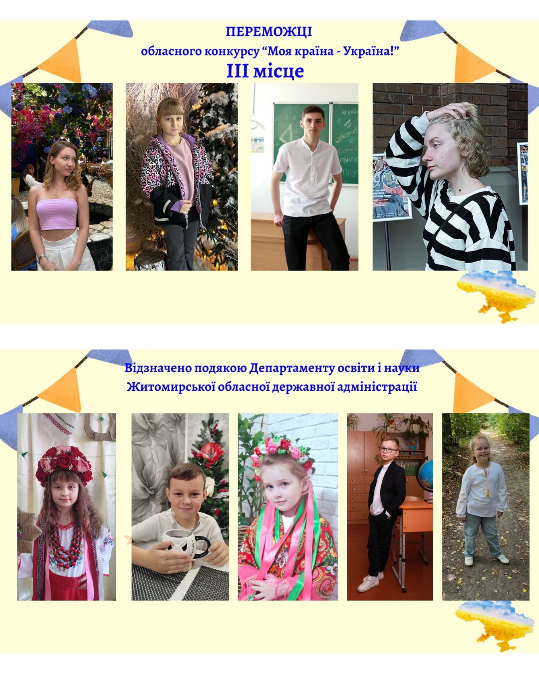 Щиро вітаємо талановитих учнів Черняхівського ліцею №2 та їхніх наставників з перемогою в **обласному конкурсі «Моя країна – Україна»**!