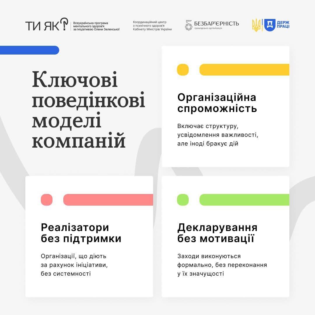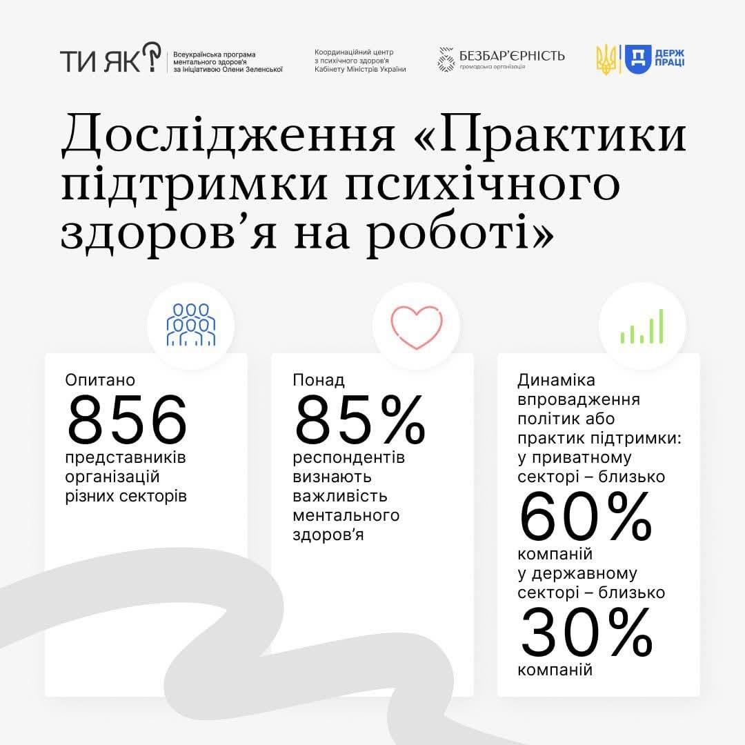 ℹ️Дослідження «Практики підтримки психічного здоров’я на роботі» провели Координаційний центр з психічного здоров’я КМУ й ГО «Безбар’єрність» спільно з Державною службою України з питань праці в межах Всеукраїнської програми ментального здоров’я «Ти як?».