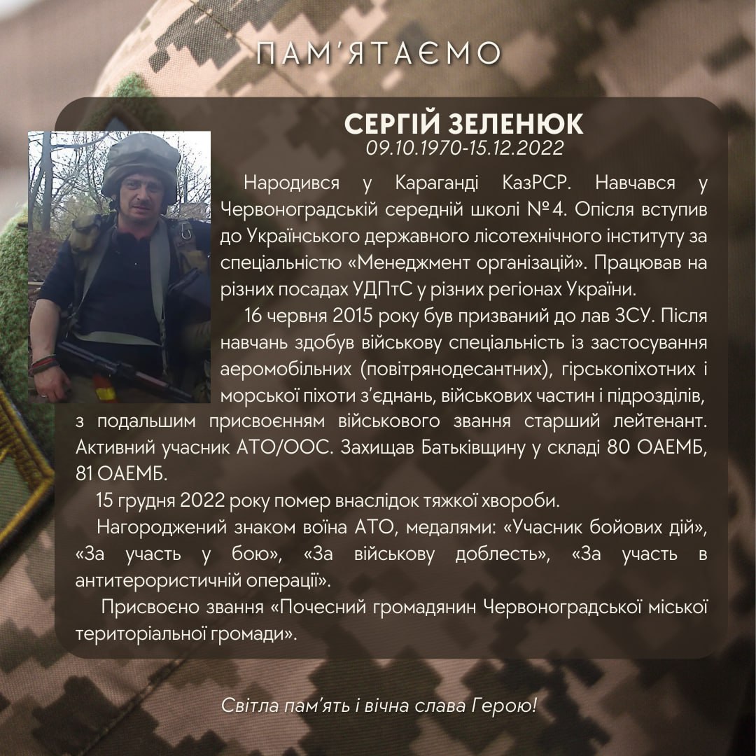 Сьогодні минає три роки як відійшов у вічність Захисник України Сергій Зеленюк. У цю скорботну мить схиляємо голову перед Героєм, який віддав найцінніше – власне життя за незалежність України та за кожного з нас.