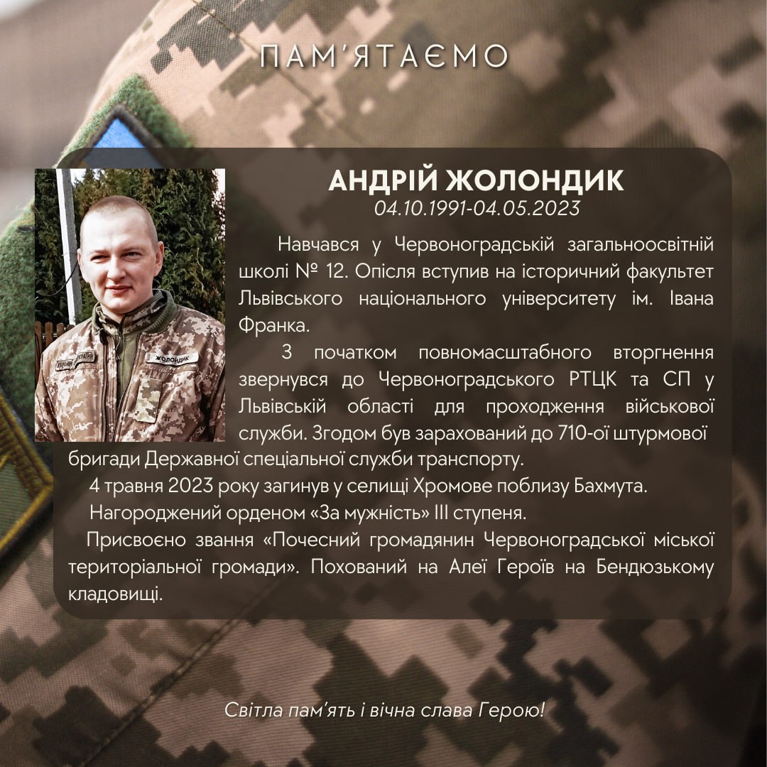 Сьогодні, в цю скорботну мить, схиляємо голову перед Героєм Андрієм Жолондиком.