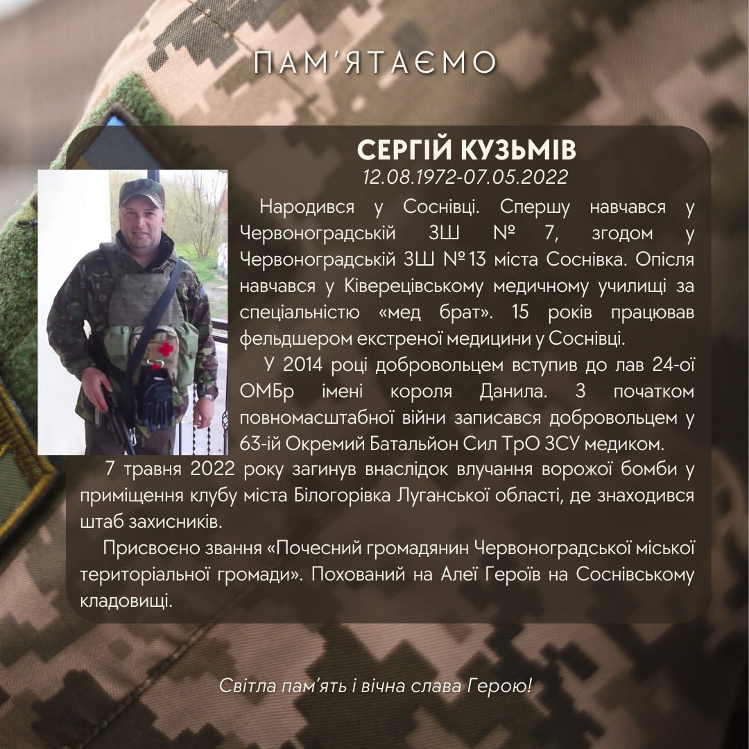 Сьогодні, в цю скорботну мить, схиляємо голову перед Героєм Сергієм Кузьмівим.
