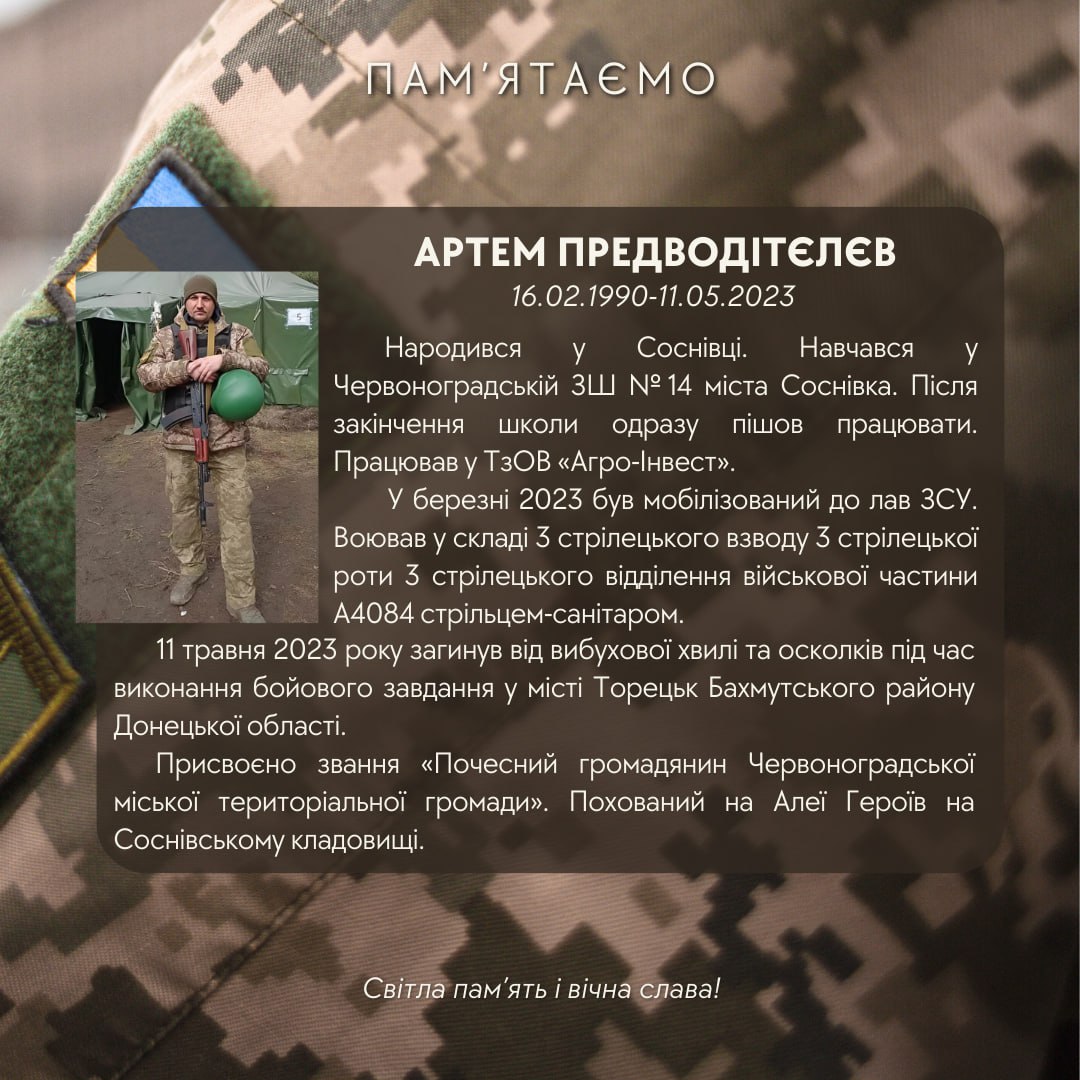 Сьогодні, в цю скорботну мить, схиляємо голову перед Героєм Артемом Предводітєлєвим.