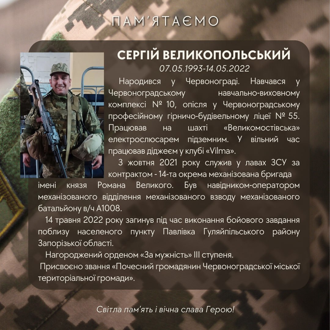 Сьогодні, в цю скорботну мить, схиляємо голову перед Героєм Сергієм Великопольським.