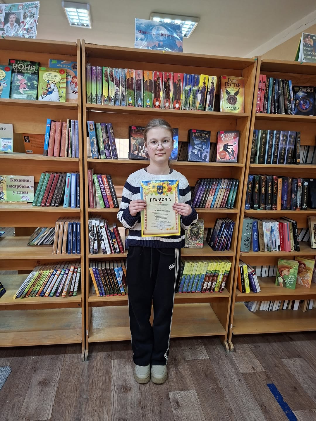 Юна користувачка Центральної публічної бібліотеки Анастасія Костюк здобула перемогу в обласному турі Всеукраїнського дитячого літературного конкурсу у номінації «Далі буде? Ні, «далі» – вже є!» та нагороджена грамотою Полтавської обласної універсальної наукової бібліотеки імені І.П. Котляревського (керівник роботи Людмила Лещенко).