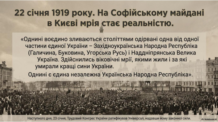 22 січня 1919 року на Софійському майдані в Києві в урочистій атмосфері відбулося проголошення Акта злуки (об’єднання) Української Народної Республіки і Західно-Української Народної Республіки в єдину незалежну державу. У зачитаному на зборах «Універсалі соборності», зокрема, відзначалося: «Однині воєдино зливаються століттями одірвані одна від одної частини єдиної України – Західноукраїнська Народна Республіка (Галичина, Буковина, Угорська Русь) і Наддніпрянська Велика Україна. Здійснились віковічні мрії, якими жили і за які умирали кращі сини України. Однині є єдина незалежна Українська Народна Республіка».