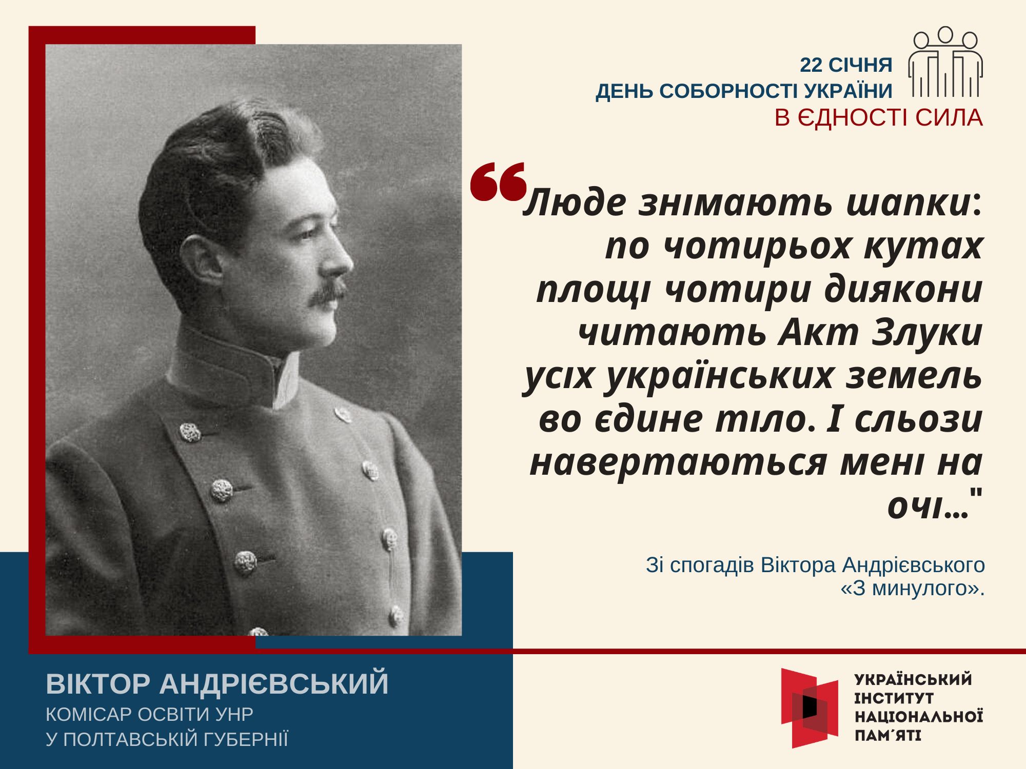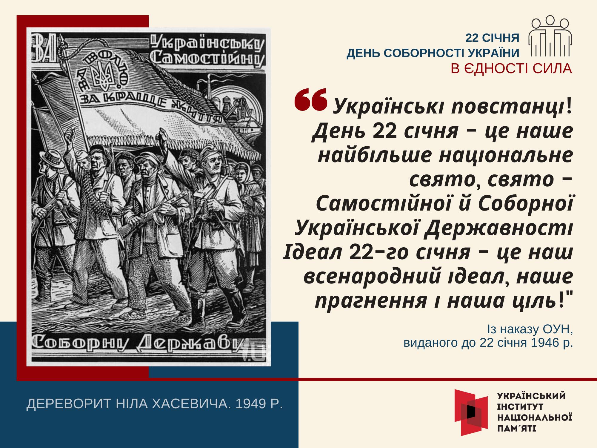 22 січня 1919 року на Софійському майдані в Києві в урочистій атмосфері відбулося проголошення Акта злуки (об’єднання) Української Народної Республіки і Західно-Української Народної Республіки в єдину незалежну державу. У зачитаному на зборах «Універсалі соборності», зокрема, відзначалося: «Однині воєдино зливаються століттями одірвані одна від одної частини єдиної України – Західноукраїнська Народна Республіка (Галичина, Буковина, Угорська Русь) і Наддніпрянська Велика Україна. Здійснились віковічні мрії, якими жили і за які умирали кращі сини України. Однині є єдина незалежна Українська Народна Республіка».