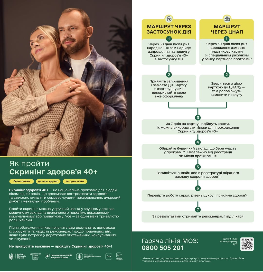 📑 Скринінг — це обстеження, тести та інші процедури для виявлення хвороб або факторів ризику в людей без симптомів. Це простий і безпечний спосіб завчасно виявити хвороби, які можуть непомітно розвиватися й проявитися пізніше вже у вигляді ускладнень. А 40+ — це вік, коли різко зростає ризик розвитку серцево-судинних хвороб і діабету.