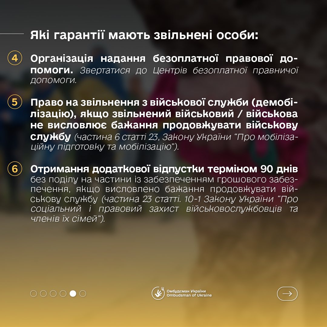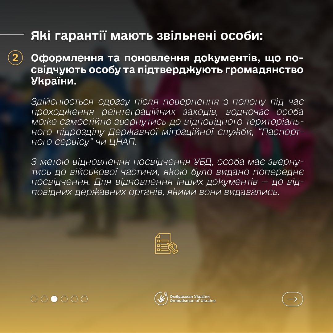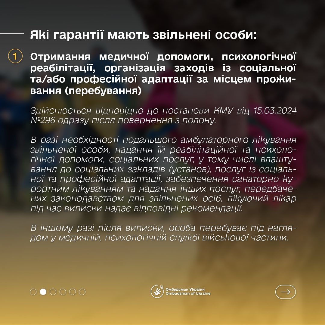 «Ця категорія військовослужбовців має право на різноманітні соціальні гарантії, які включають медичну допомогу, правову підтримку, фінансову допомогу, а також допомогу у відновленні документів та адаптації до мирного життя», — повідомив Уповноважений.