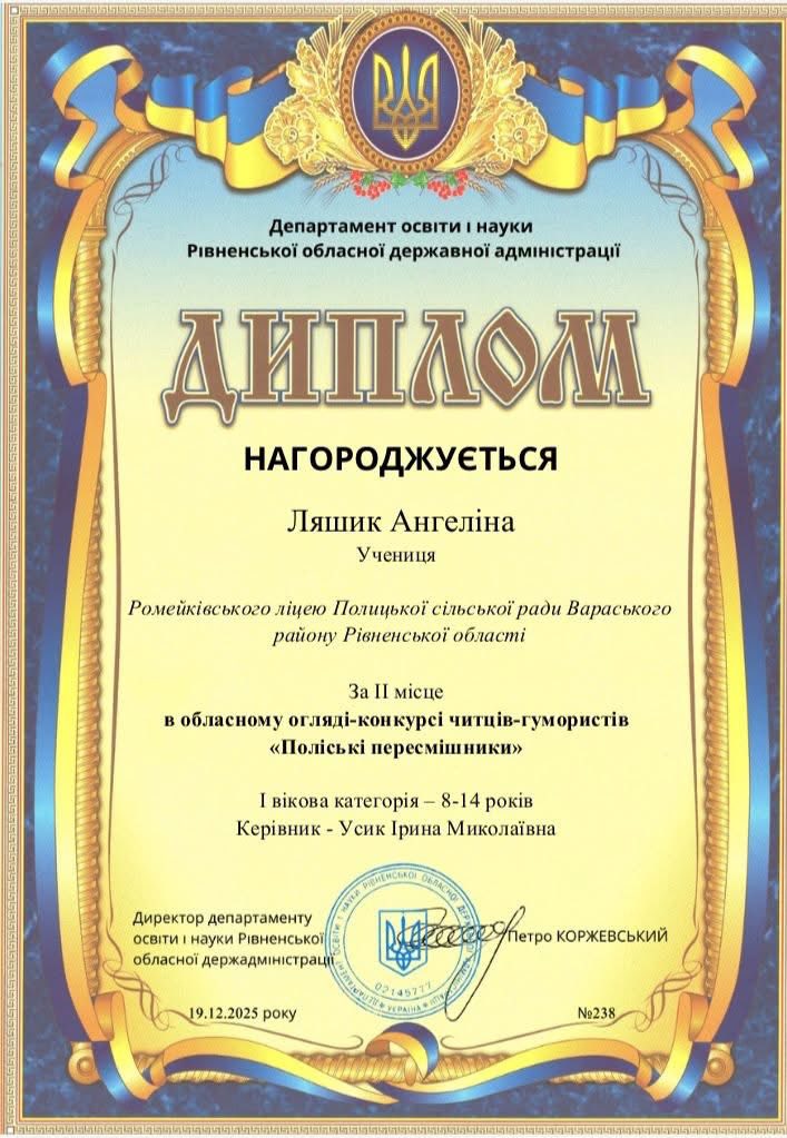 🏆 Приємно відзначити, що учениця 6 класу Ромейківський ліцей Ляшик Ангеліна виборола ІІ місце.