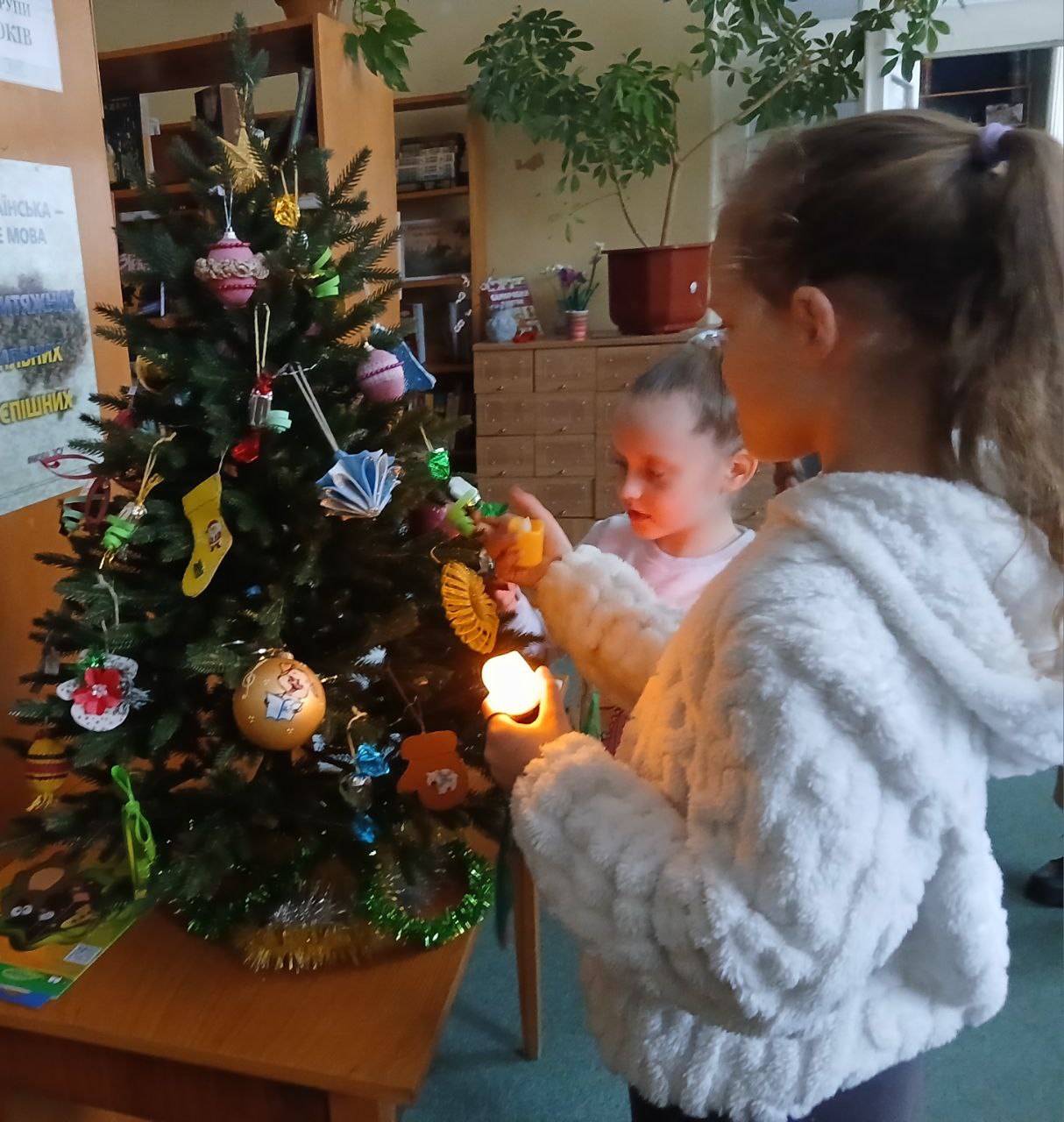 🎄 Красуня-ялиночка, прикрашена іграшками зробленими дітьми власноруч. Тут же і цукерочки в різнокольорових блискучих обгортках. До кожної прикріплена серпантинова смужка з побажаннями – цитатами з книжок про Різдво і Новий рік. Кожному своє побажання-передбачення.
