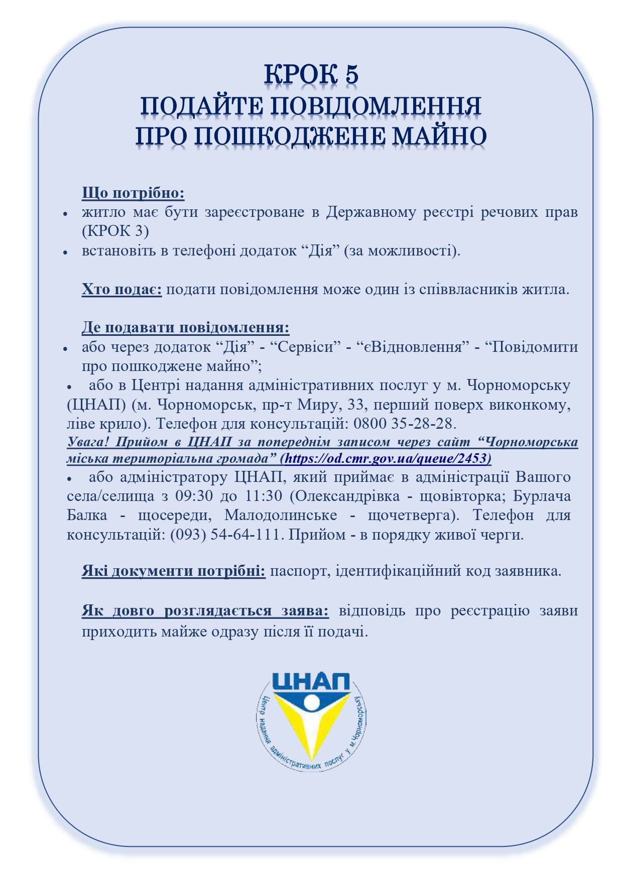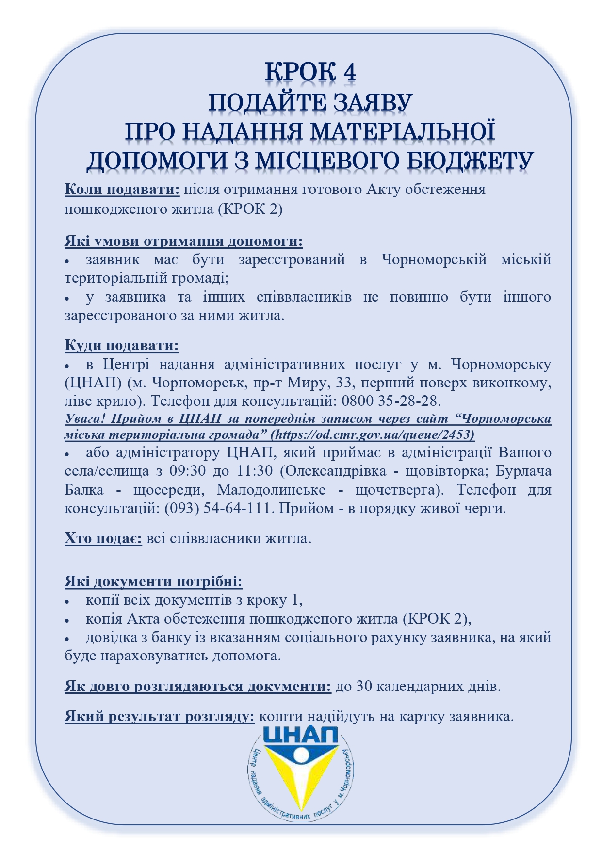 Жителям Чорноморської міської територіальної громади, які не знають з чого почати та куди подавати документи для отримання матеріальної допомоги та компенсації за пошкоджене/зруйноване житло, рекомендуємо ознайомитись з покроковою інструкцією👇