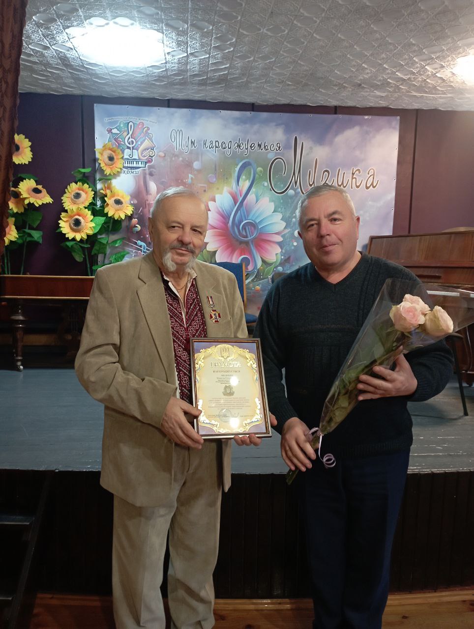 Вітаючи ювіляра, Володимир Коваленко висловив щиру вдячність за багаторічну сумлінну працю, відданість професії та виховання дітей, побажав міцного здоров’я, родинного затишку, життєвого благополуччя та нових творчих звершень. Також селищний голова виконав почесну місію — вручив Миколі Георгійовичу Грамоту Звенигородської районної військової адміністрації за високий професіоналізм, особистий внесок у музичне виховання підростаючого покоління та активну культурно-просвітницьку діяльність у Калинопільській територіальній громаді.
