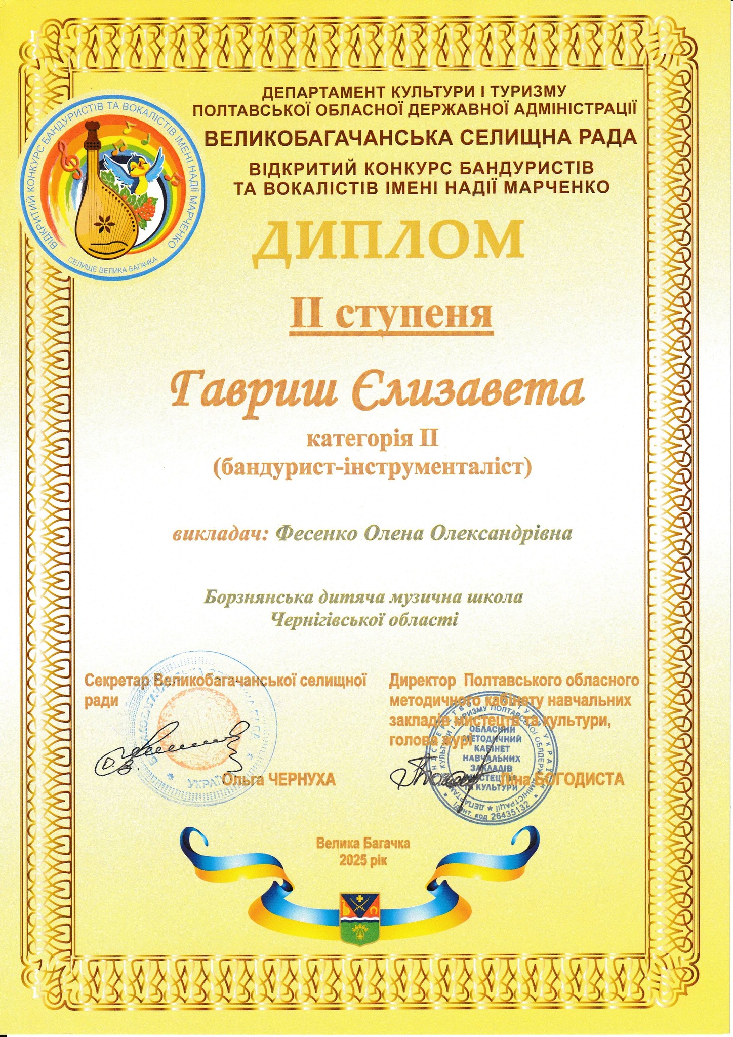 🥈 ІІ місце – Єлизавета Гавриш (номінація «Бандурист-інструменталіст»);