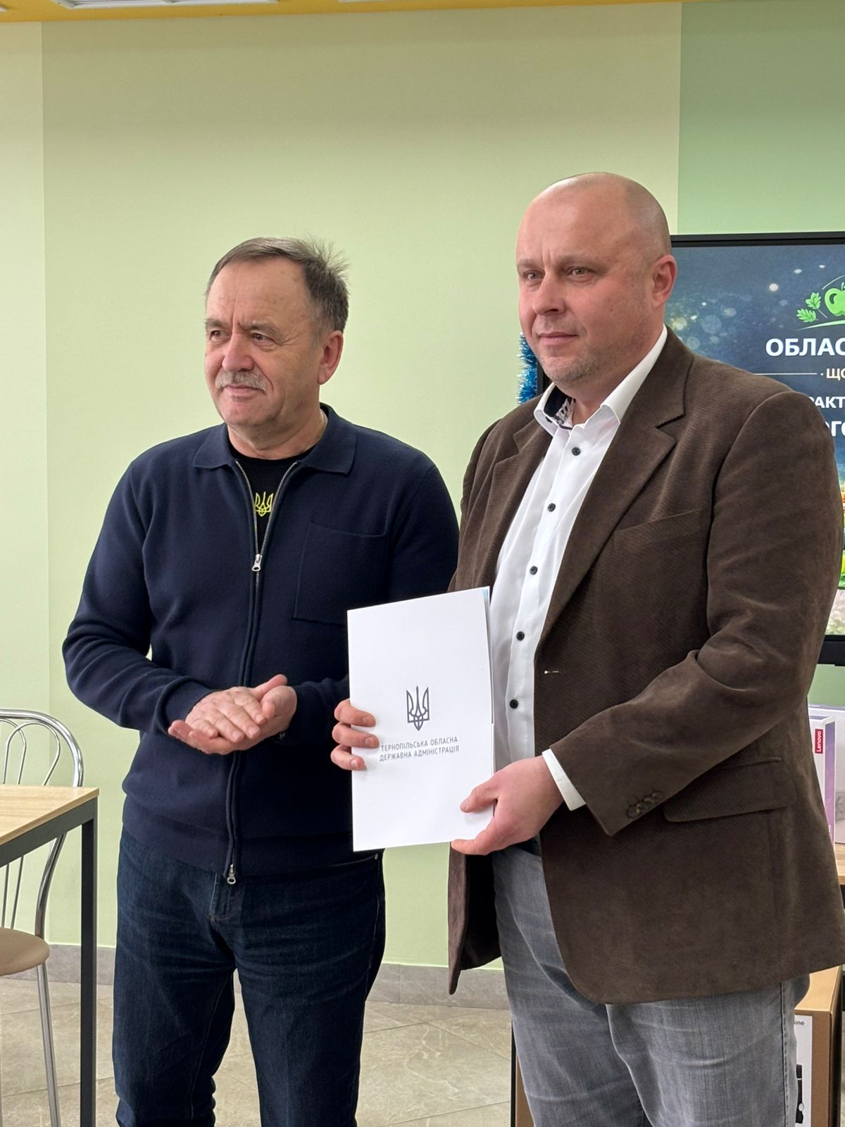 Голова Тернопільської ОВА В’ячеслав Негода вручив грамоту та цінний подарунок директору Юськовецького ЗЗСО І–ІІІ ступенів Олексію Серафиму.