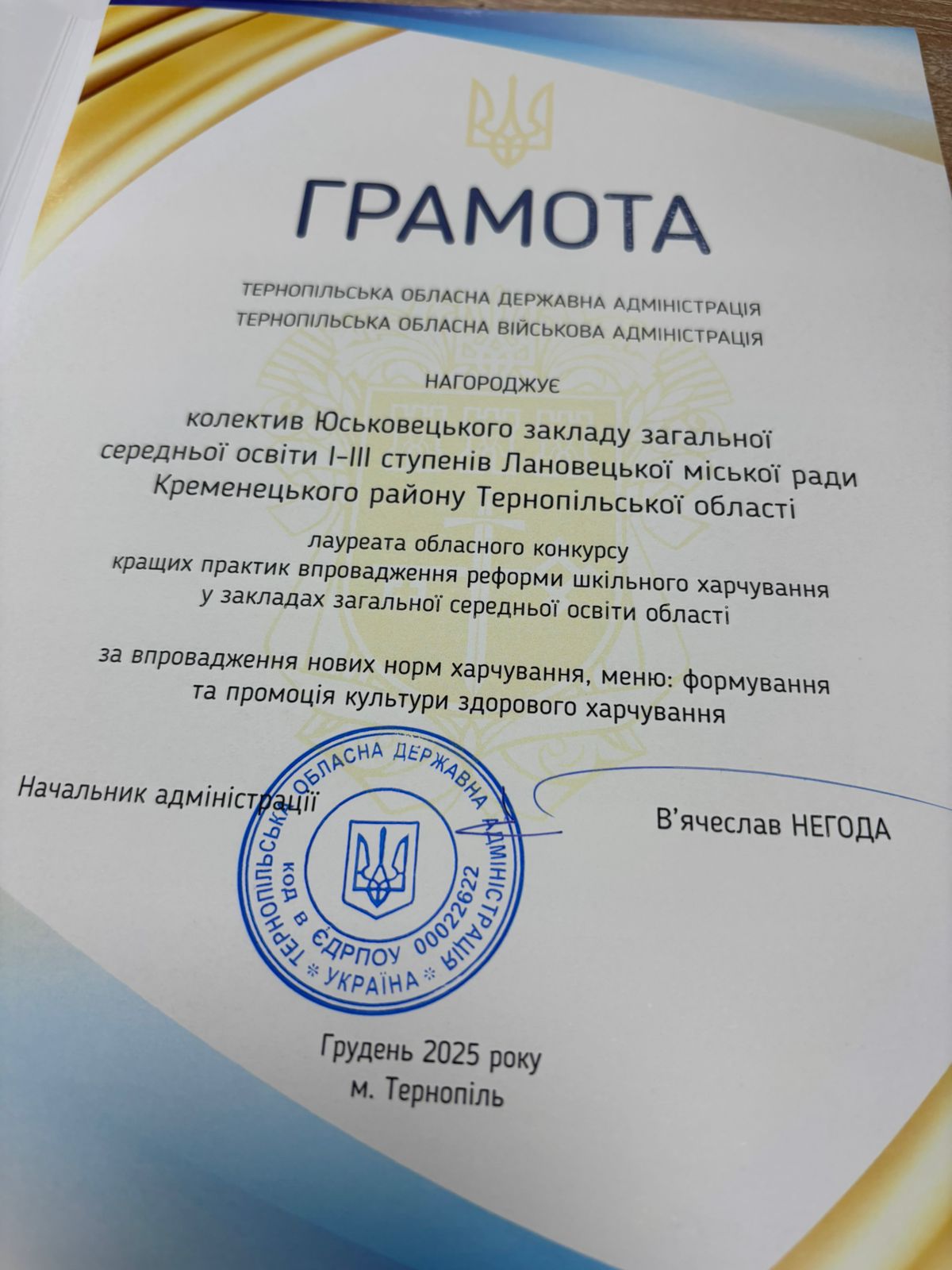 Юськовецький заклад загальної середньої освіти І–ІІІ ступенів відзначено в номінації «Впровадження нових норм харчування, меню: формування та промоція культури здорового харчування».