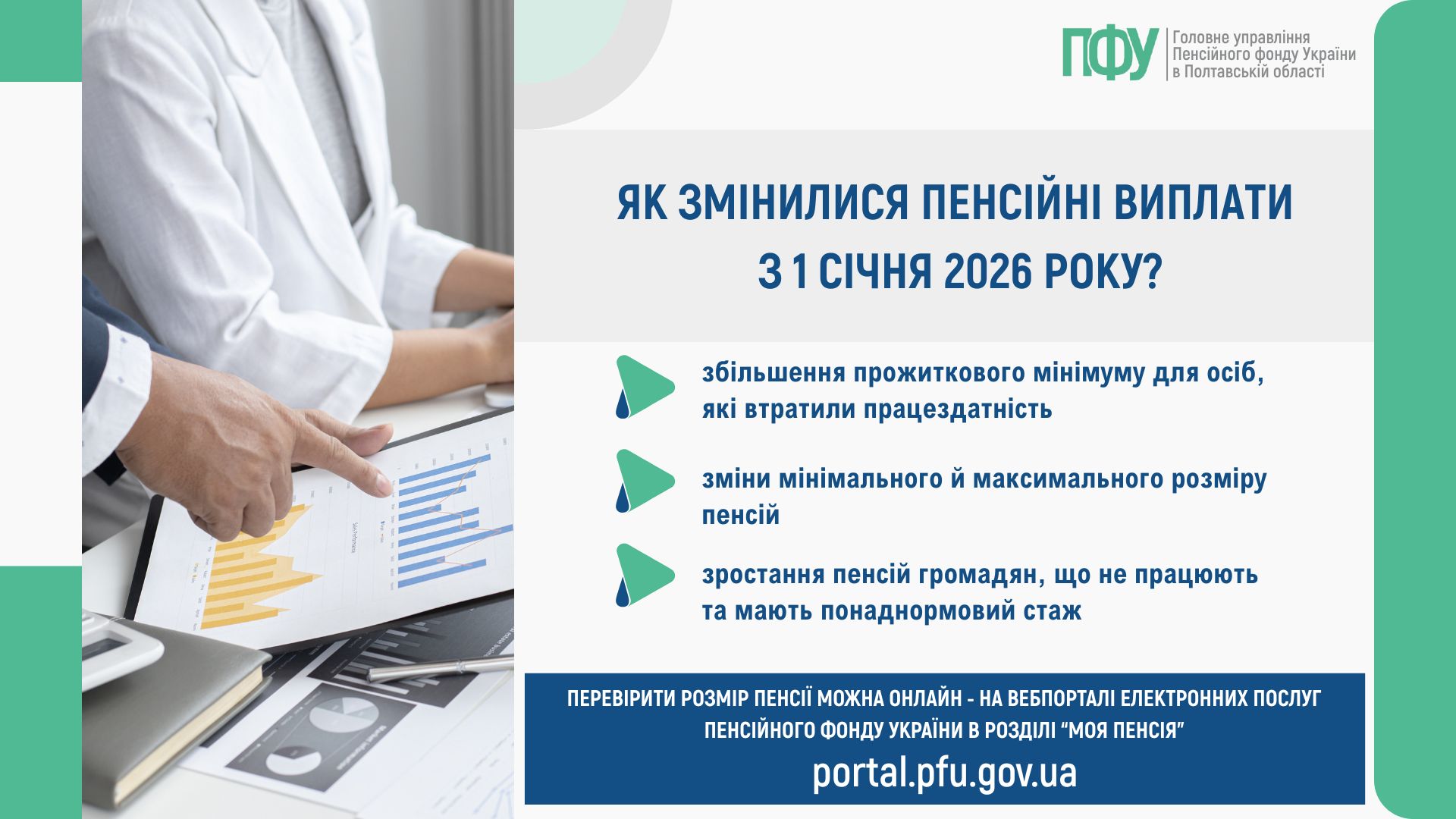 На підставі статті 7 Закону України «Про Державний бюджет України на 2026 рік» у Головному управлінні Пенсійного фонду України в Полтавській області провели автоматичні (без додаткового звернення особи) перерахунки пенсій з 1 січня 2026 року.