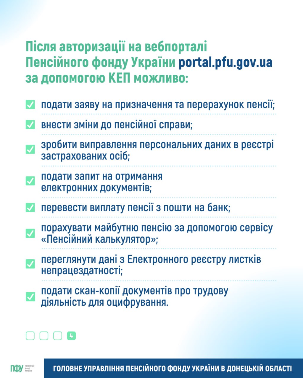Авторизувавшись на вебпорталі Пенсійного фонду України https://portal.pfu.gov.ua за допомогою КЕП, можливо: