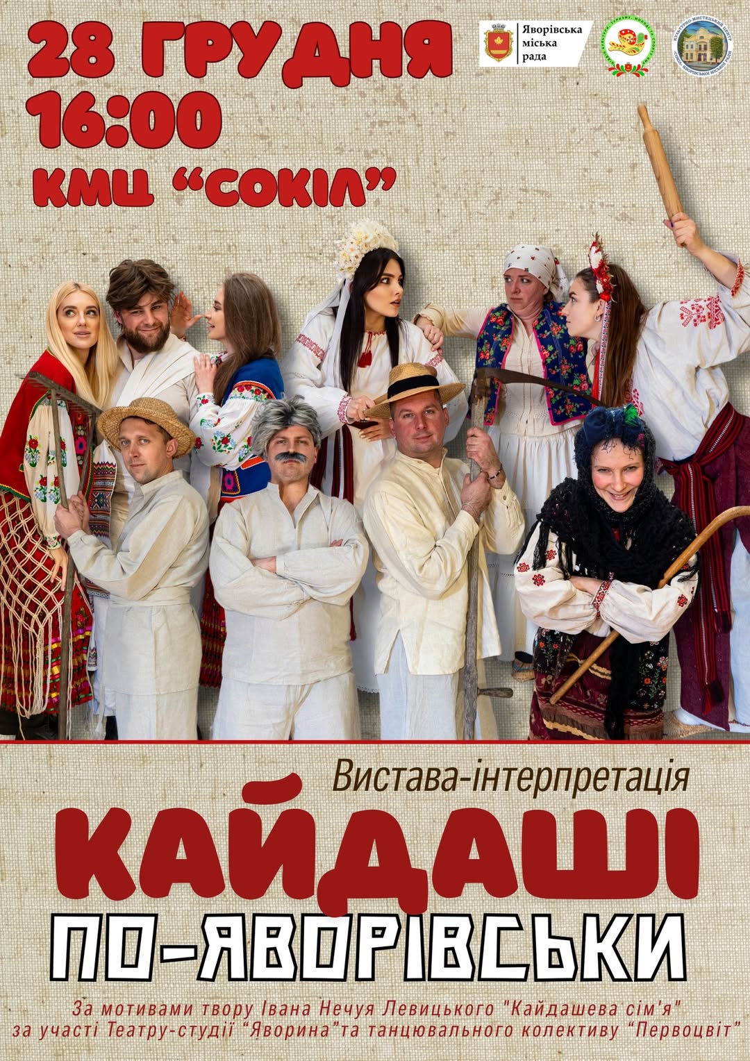 ♦️ Запрошуємо вас на неймовірну прем’єру — виставу «КАЙДАШІ ПО-ЯВОРІВСЬКИ»! Ми взяли класику Івана Нечуя-Левицького, додали нашого яворівського гумору, дрібку танцювального драйву та щирих емоцій. Актори Театру-студії «Яворина» та танцювальний колектив “Первоцвіт” подарують Вам гострі враження та справжній драйв на сцені!
