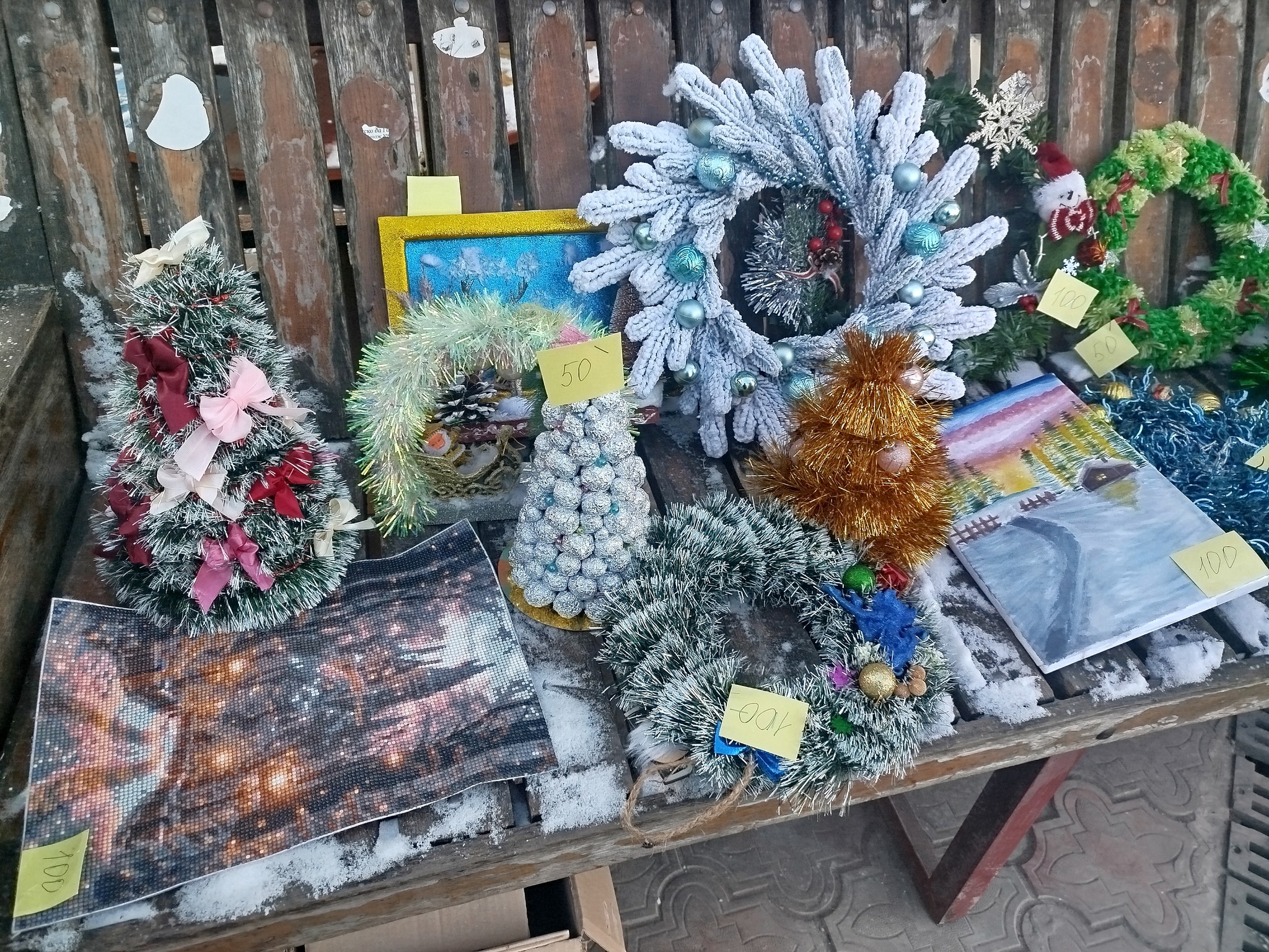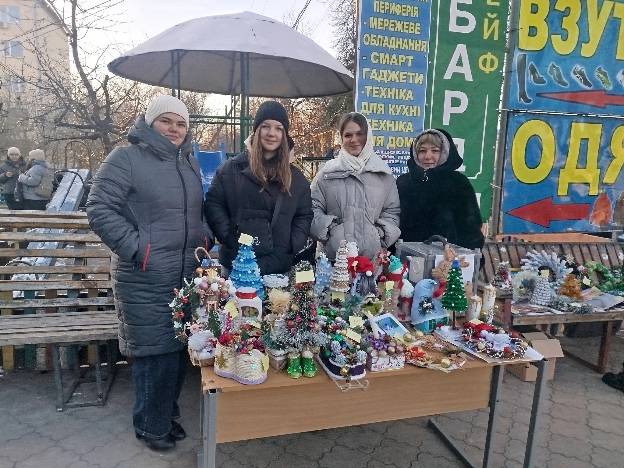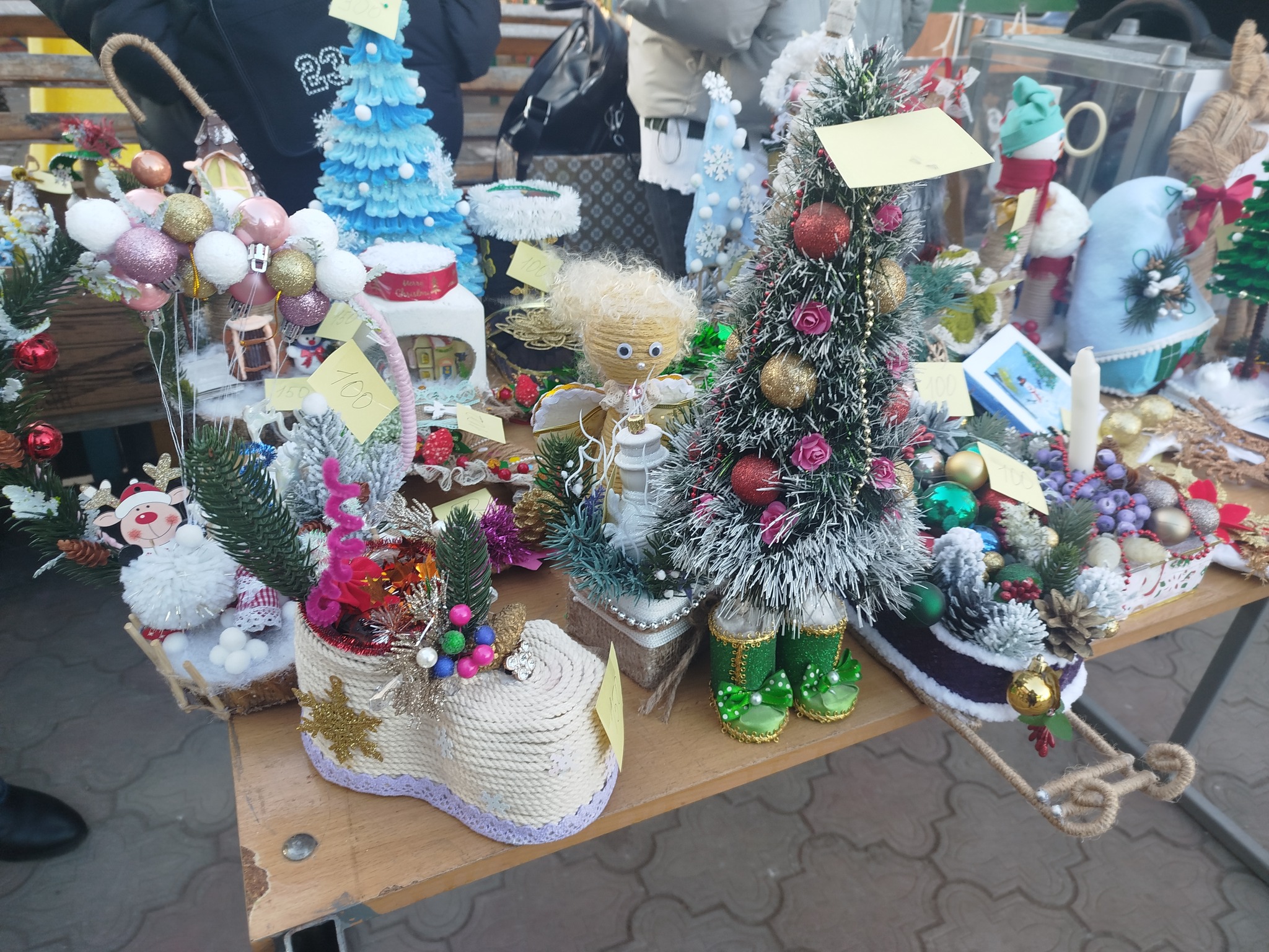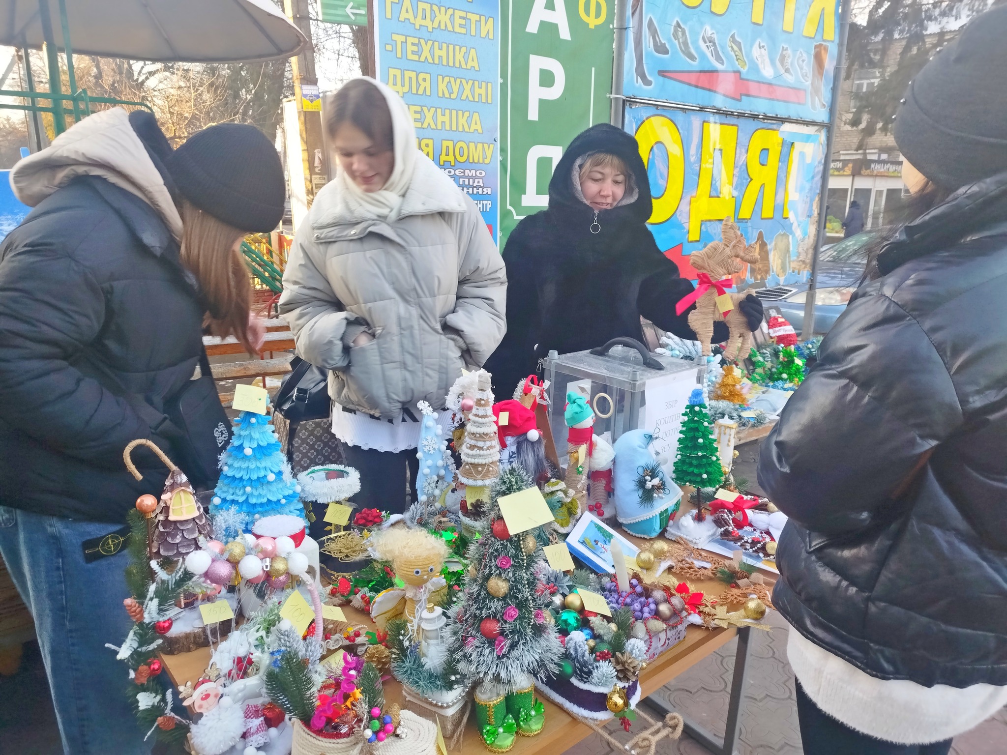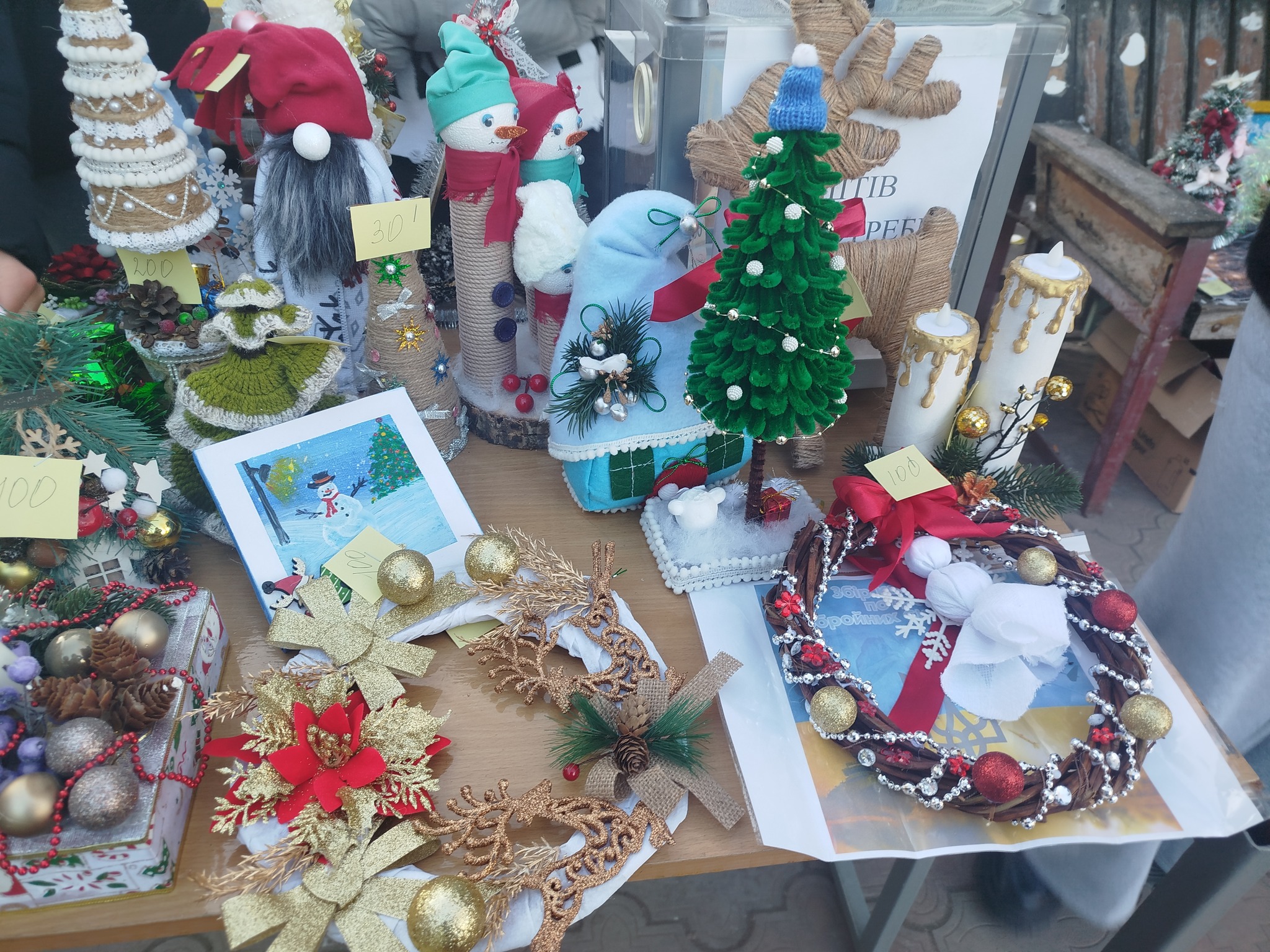 Саме тому народжується ідея благодійних ярмарків, де дитячі руки творять дивовижні вироби. Сьогодні вони — до Різдва Христового і Нового року. Молодь ліцею № 1, попри морозний день і змерзлі рученята, підстрибуючи то на одній, то на іншій ніжці, мужньо перемагаючи холод, пропонує ялинкові прикраси, свічки та свічники, різдвяні вінки й композиції, іграшки, сувеніри, картини.