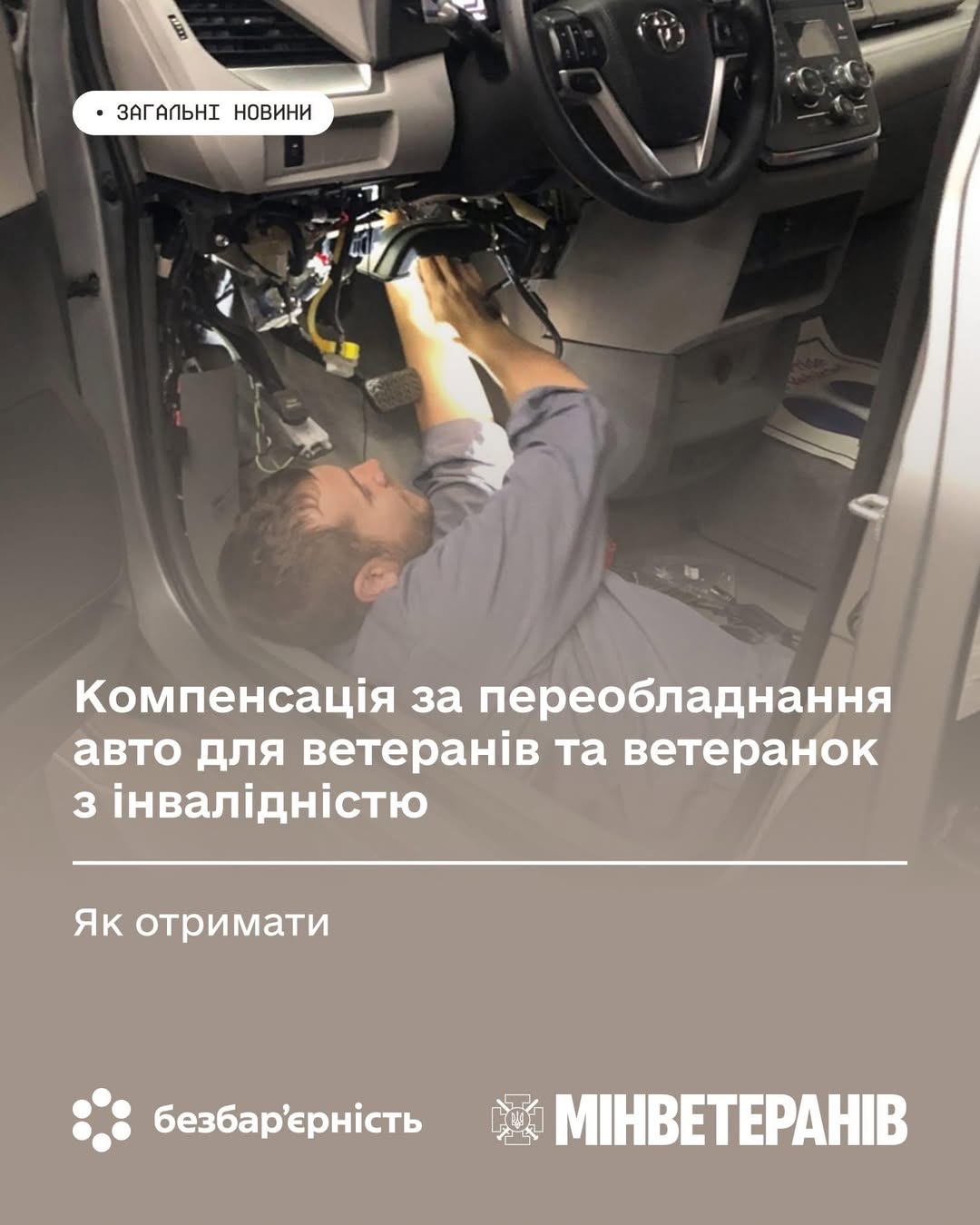 ℹ Пілотний проєкт впроваджується Мінветеранів відповідно до постанови Кабінету Міністрів України від 7 листопада 2025 р. № 1442 “Деякі питання реалізації експериментального проекту щодо призначення і виплати грошової компенсації за переобладнання (пристосування) транспортних засобів для керування особами з інвалідністю внаслідок війни” на виконання Плану заходів на 2025-2026 роки з реалізації Національної стратегії зі створення безбар’єрного простору в Україні.