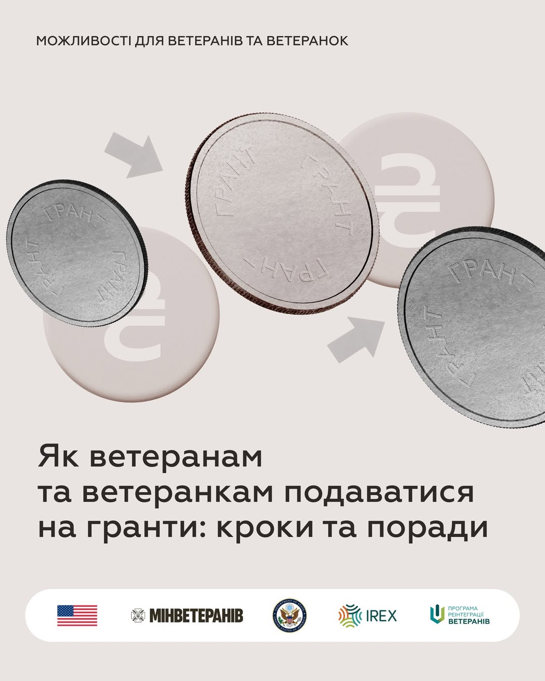 Інфокампанія «Можливості для ветеранів та ветеранок» реалізовується в межах партнерства Мінветеранів та Програми реінтеграції ветеранів, яку втілює IREX за підтримки Державного департаменту США. Зміст є виключною відповідальністю IREX та Мінветеранів і не обов’язково відображає погляди Державного департаменту США.