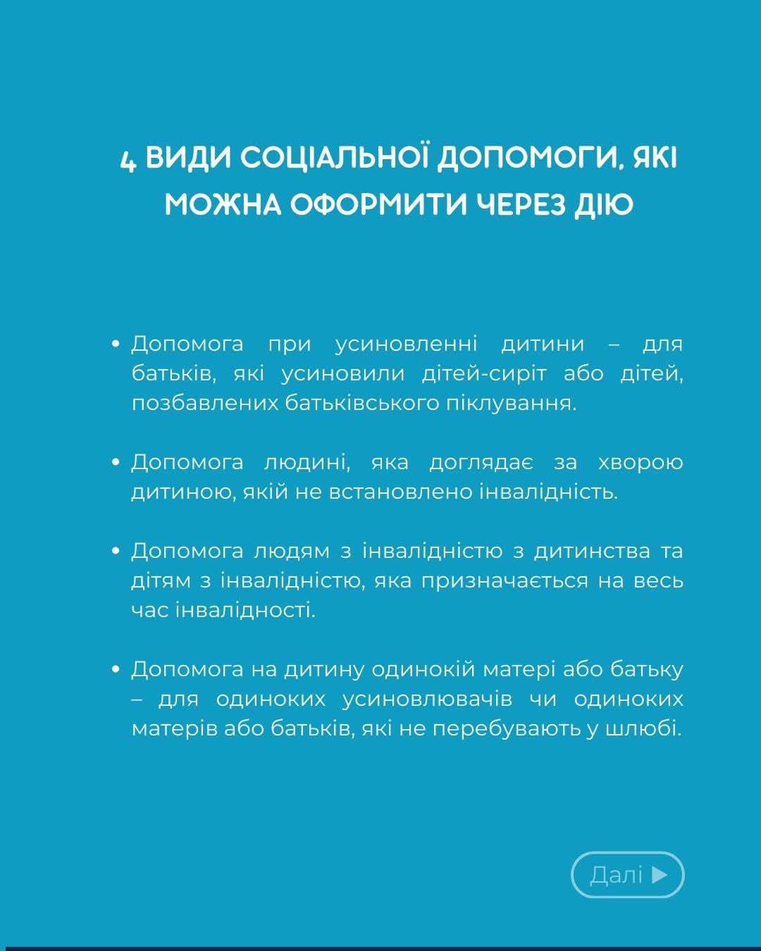 Як повідомляє МСП України на порталі Дія доступні для оформлення чотири види соціальної допомоги.