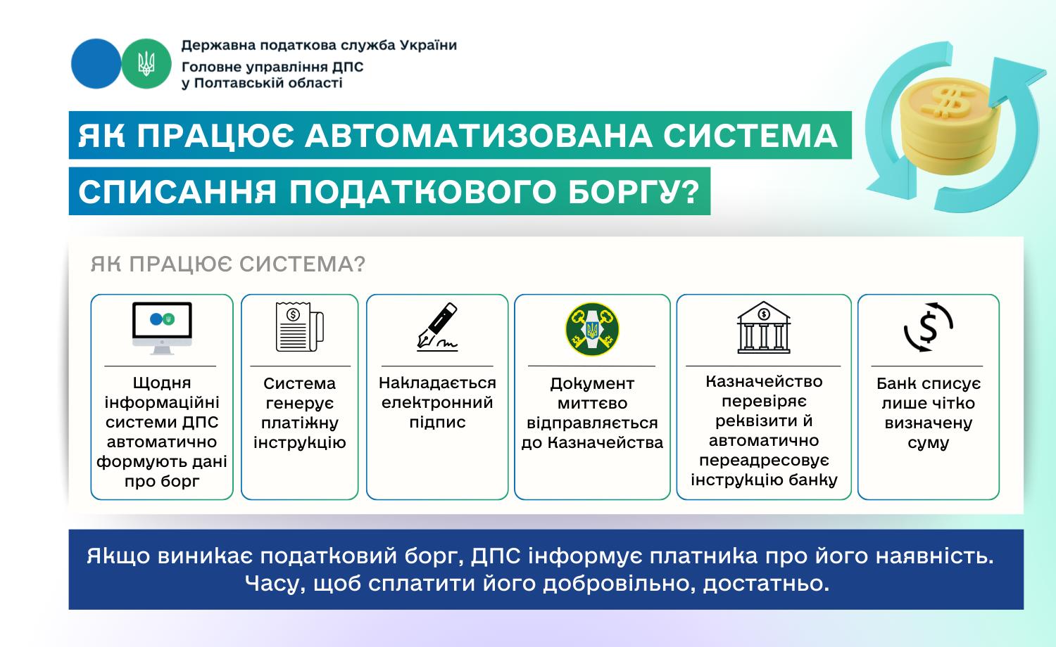 Головне управління ДПС у Полтавській області нагадує, що нещодавно запрацювала нова система автоматичного стягнення податкового боргу.