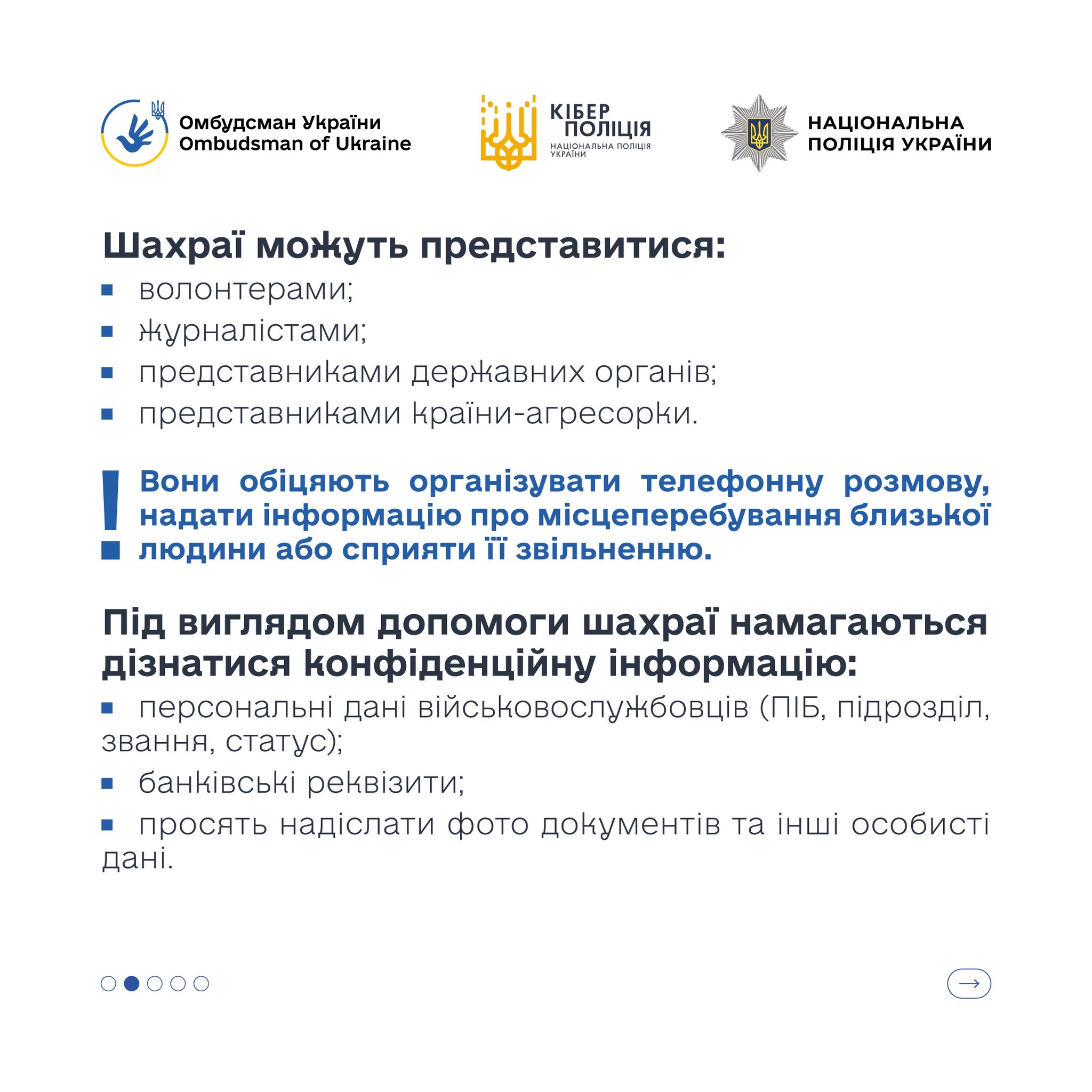 Омбудсман України Дмитро Лубінець повідомив, що шахраї активно відстежують родини полонених і зниклих безвісти у соцмережах. Вони швидко виходять на контакт, представляються «посередниками» або «представниками органів» й обіцяють допомогу.