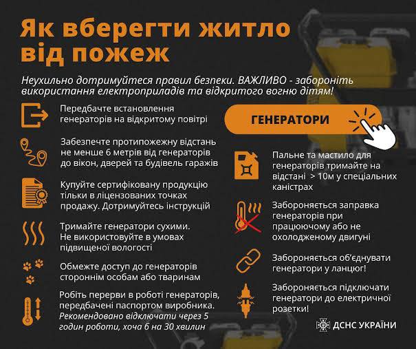 ☝🏼Зокрема, не залишайте відкритий вогонь без нагляду, використовуйте лише справні та сертифіковані прилади, дотримуйтеся безпечних відстаней від легкозаймистих матеріалів. Під час користування пічним опаленням регулярно перевіряйте стан печей і димоходів.