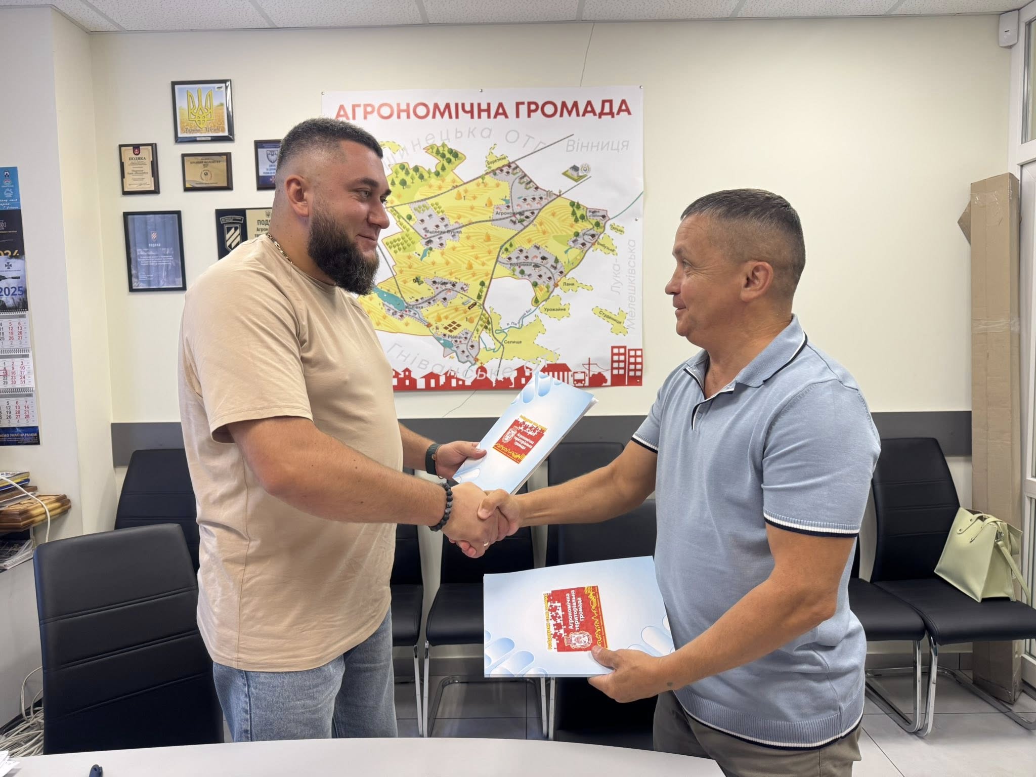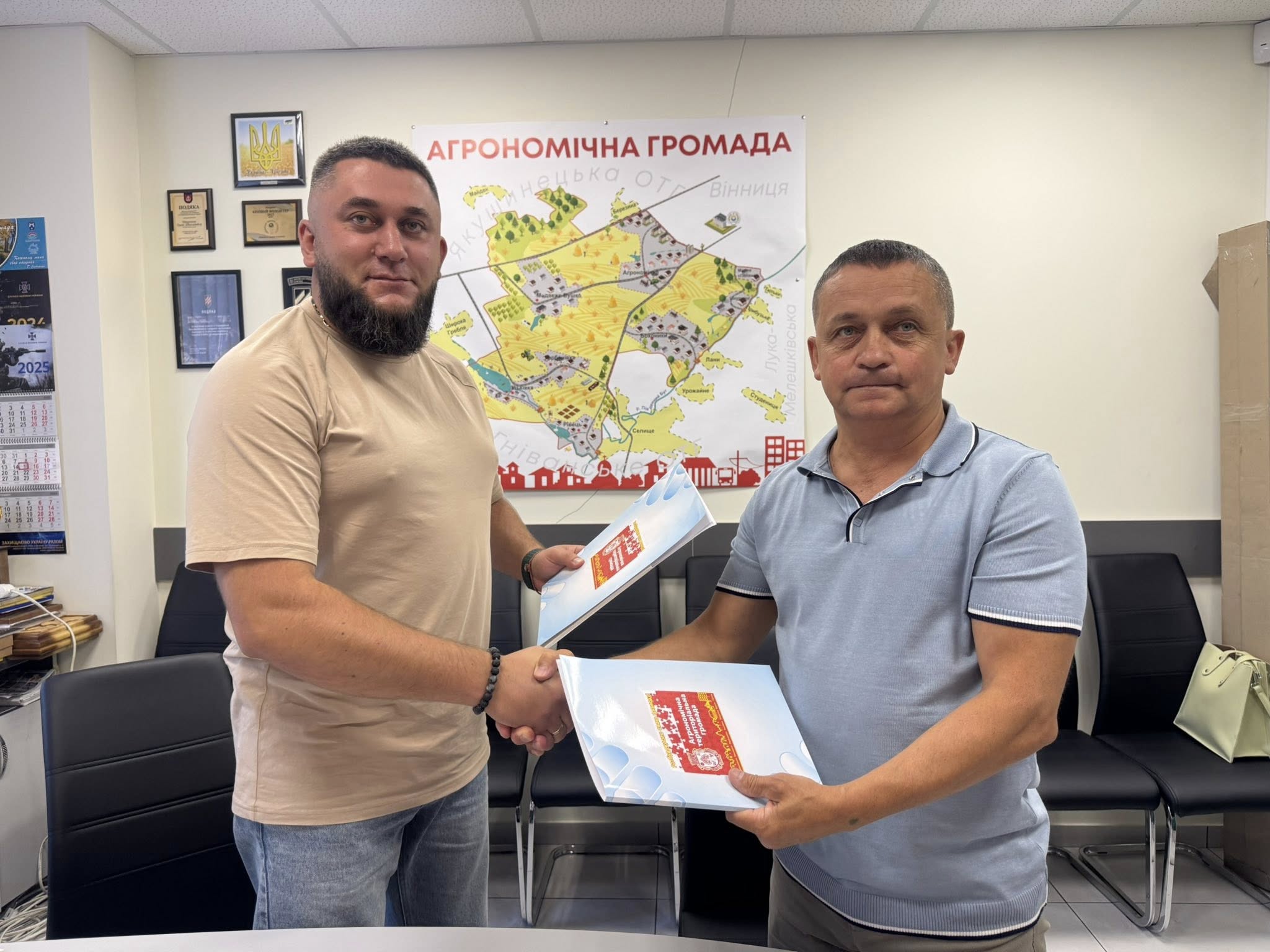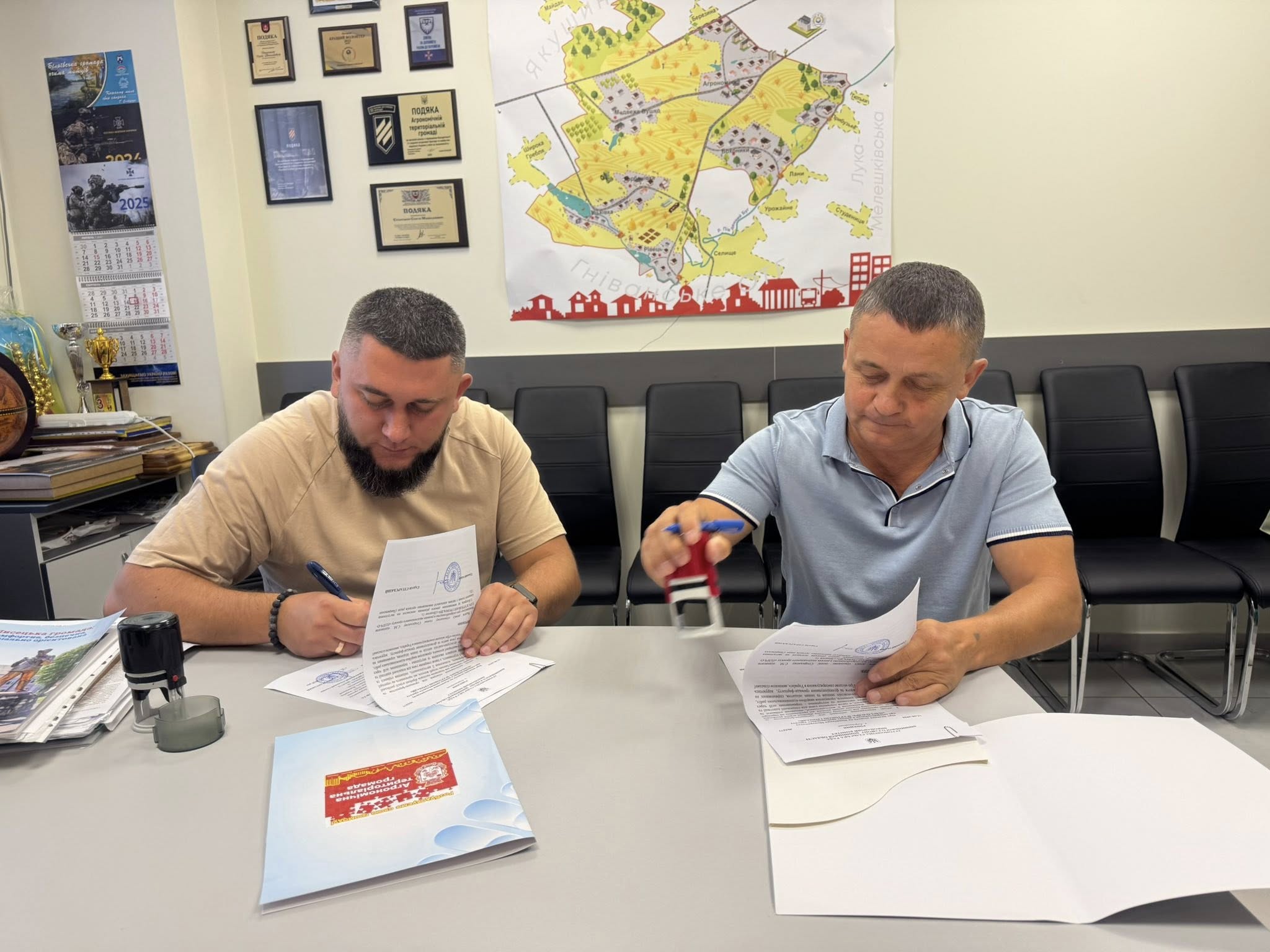 У рамках реалізації Національного проєкту «Пліч-о-пліч: згуртовані громади», ініційованого Міністерством розвитку громад та територій України, відбулася важлива робоча зустріч. Сільський голова Агрономічної громади Сергій Сітарський провів переговори з начальником Зеленопідської сільської військової адміністрації Каховського району Євгеном Позняком. Ця зустріч мала на меті зміцнення співпраці між двома громадами, які постраждали від збройної агресії Російської Федерації.