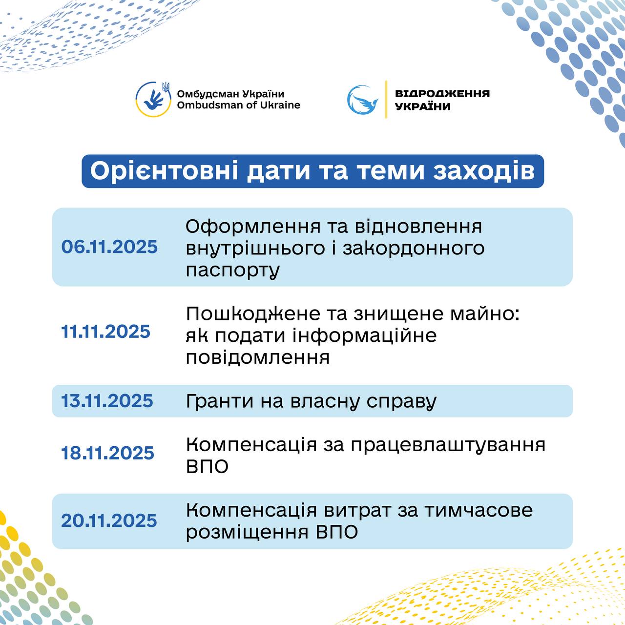 Детальнішу інформацію щодо орієнтовних дат та тем наступних заходів можна знайти в інфографіці, що додається до цієї публікації.