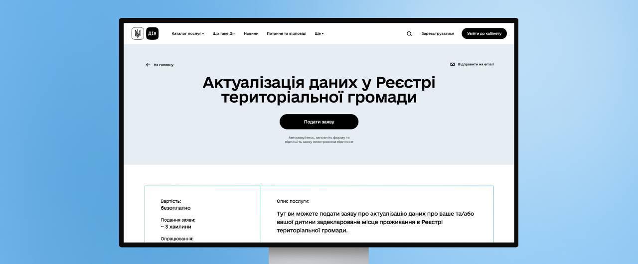 ✔️ або онлайн на порталі Дія – https://diia.gov.ua/services/aktualizaciya-danih-u-reyestri-teritorialnoyi-gromadi.
