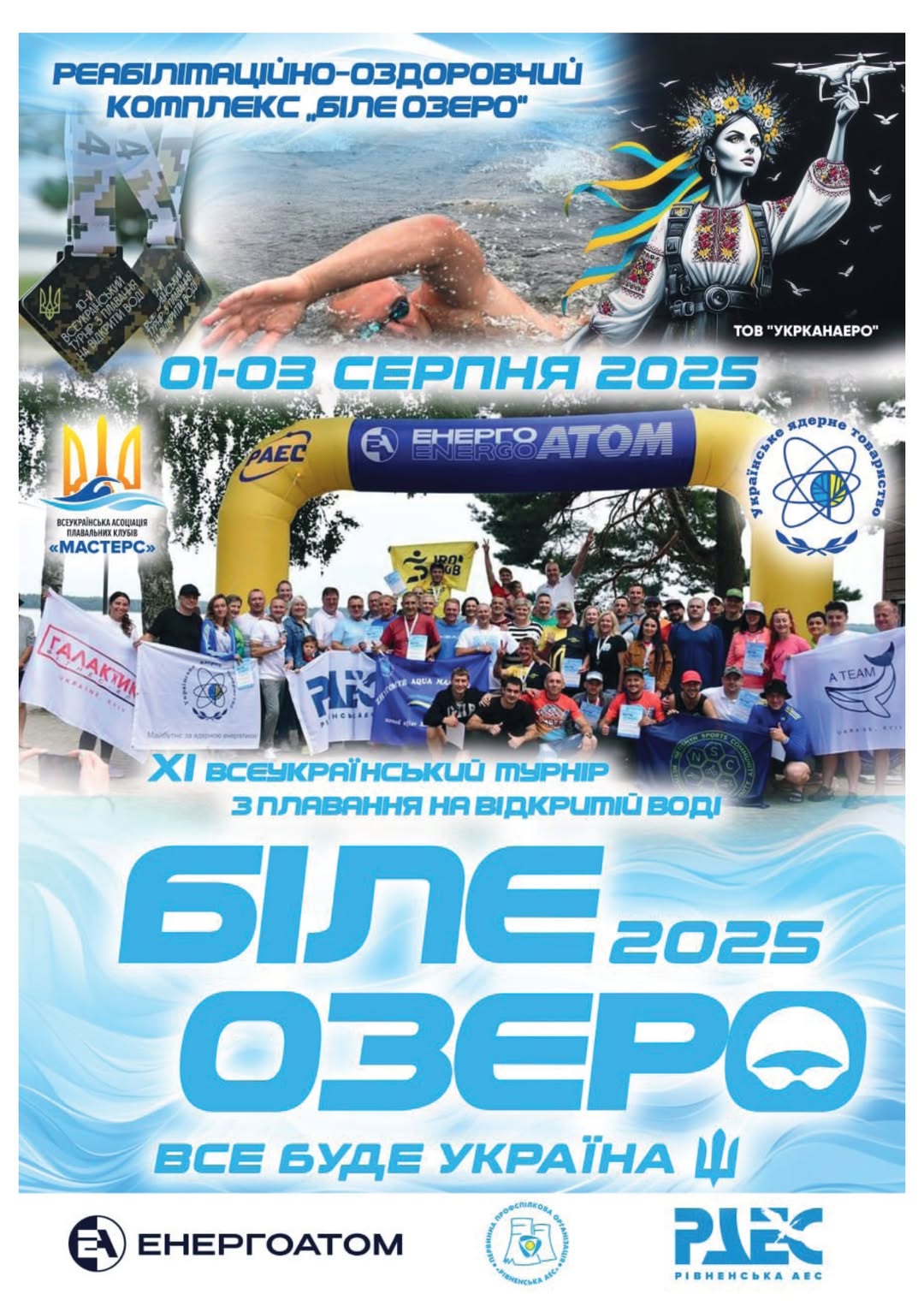 Державне підприємство “Енергоатом” запрошує всіх охочих долучитися до ХІ Всеукраїнського турніру з плавання на відкритій воді “Біле озеро 2025”. Ця благодійна подія, спрямована на підтримку Збройних Сил України, відбудеться з 1 по 3 серпня 2025 року на базі Регіонального оздоровчого комплексу “Біле озеро” Відокремленого підрозділу “Рівненська атомна електростанція” (УСО філії “ВП РАЕС”). Гаслом заходу є “Все буде Україна!”.