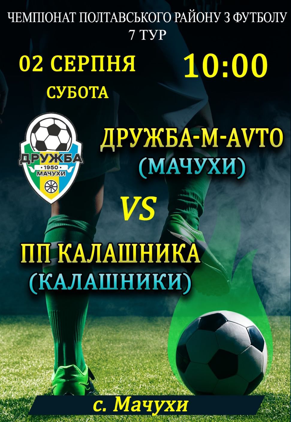 Поєдинок відбудеться на стадіоні в селі Мачухи. На полі зустрінуться беззаперечні лідери чемпіонату – команда “Дружба-М-Avto”, та їхній не менш завзятий суперник – команда “ПП Калашника”. Очікується, що гра буде надзвичайно яскравою, напруженою та цікавою для всіх присутніх.
