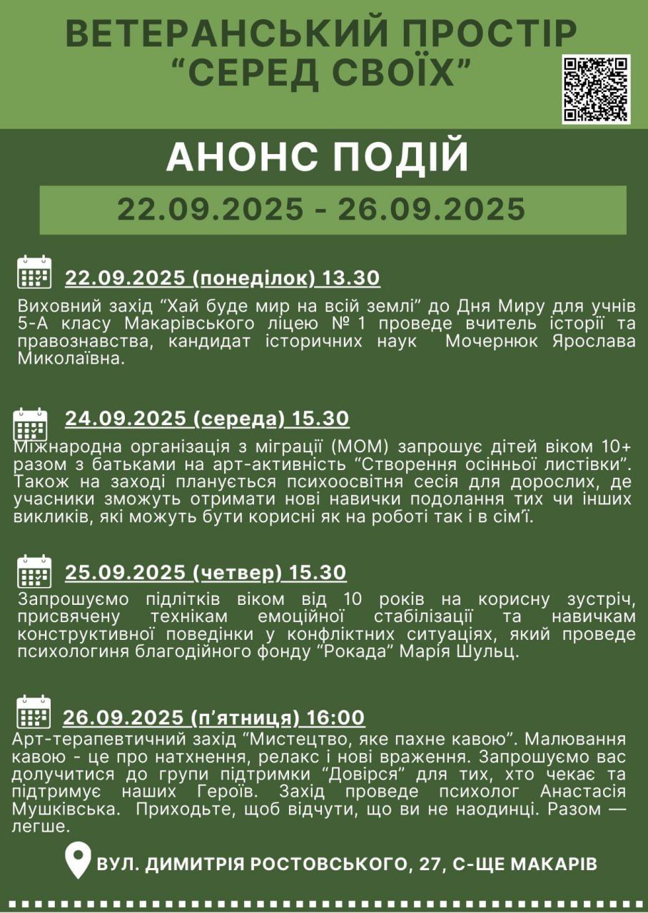 🗓 АНОНС ПОДІЙ у ветеранському просторі «СЕРЕД СВОЇХ» в Макарові.